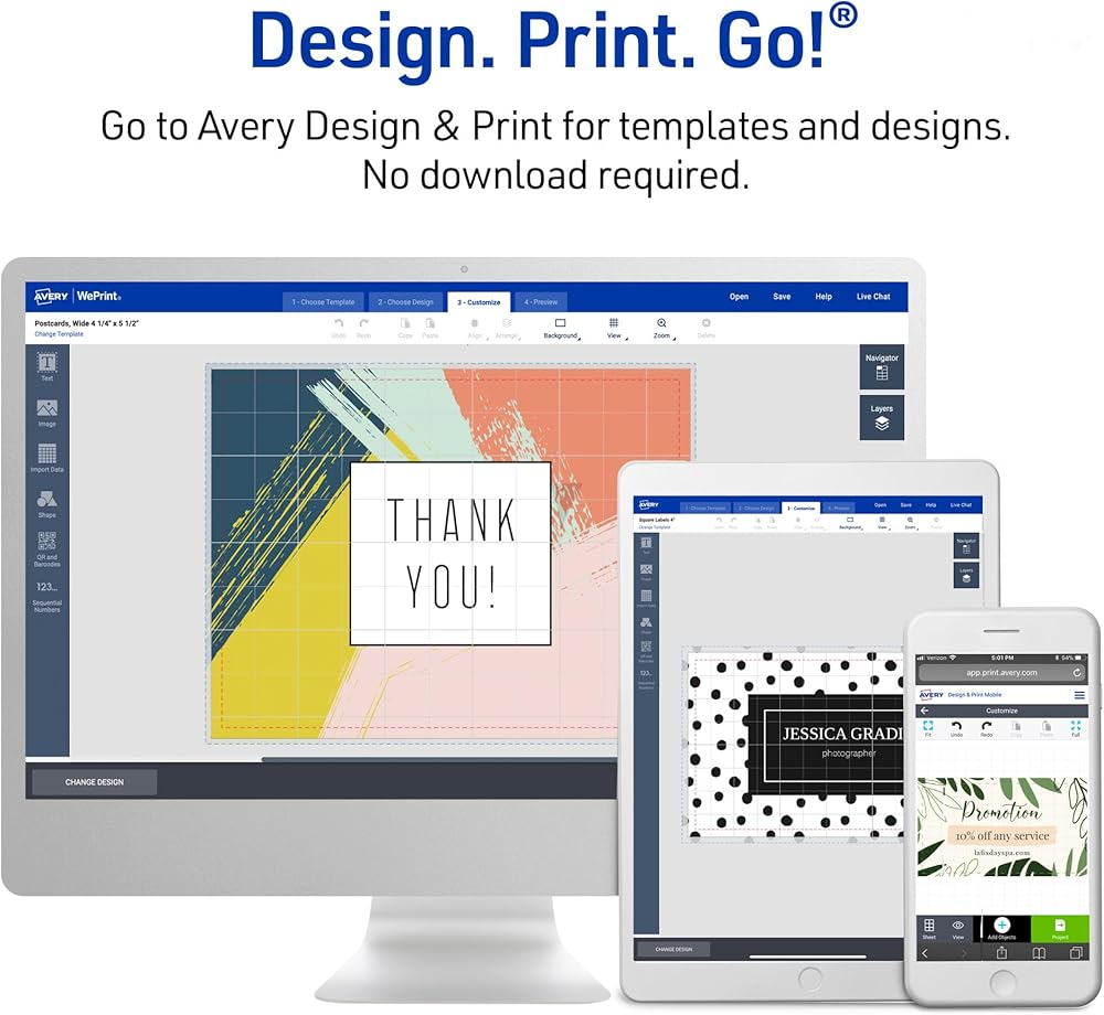 • Create next-level product packaging or promotional cards with full-color, double-sided printing that extends right to the edges of the cards with the templates and tools on the Avery site