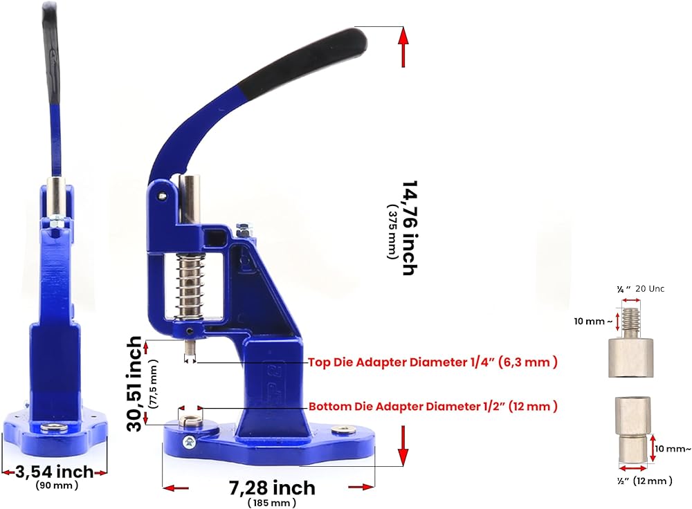 DIES SPECS : All dies have a top thread size of 6.3 mm (1/4" 20 UNC), a bottom diameter size of 11.9 mm (1/2''), and are compatible with DZNTOOLS hand press machine. If you have a different hand press, please check your hand press measurements to ensure they match the requirements of your machine.