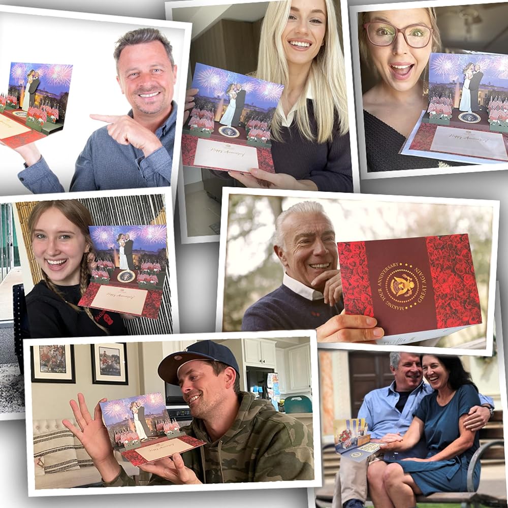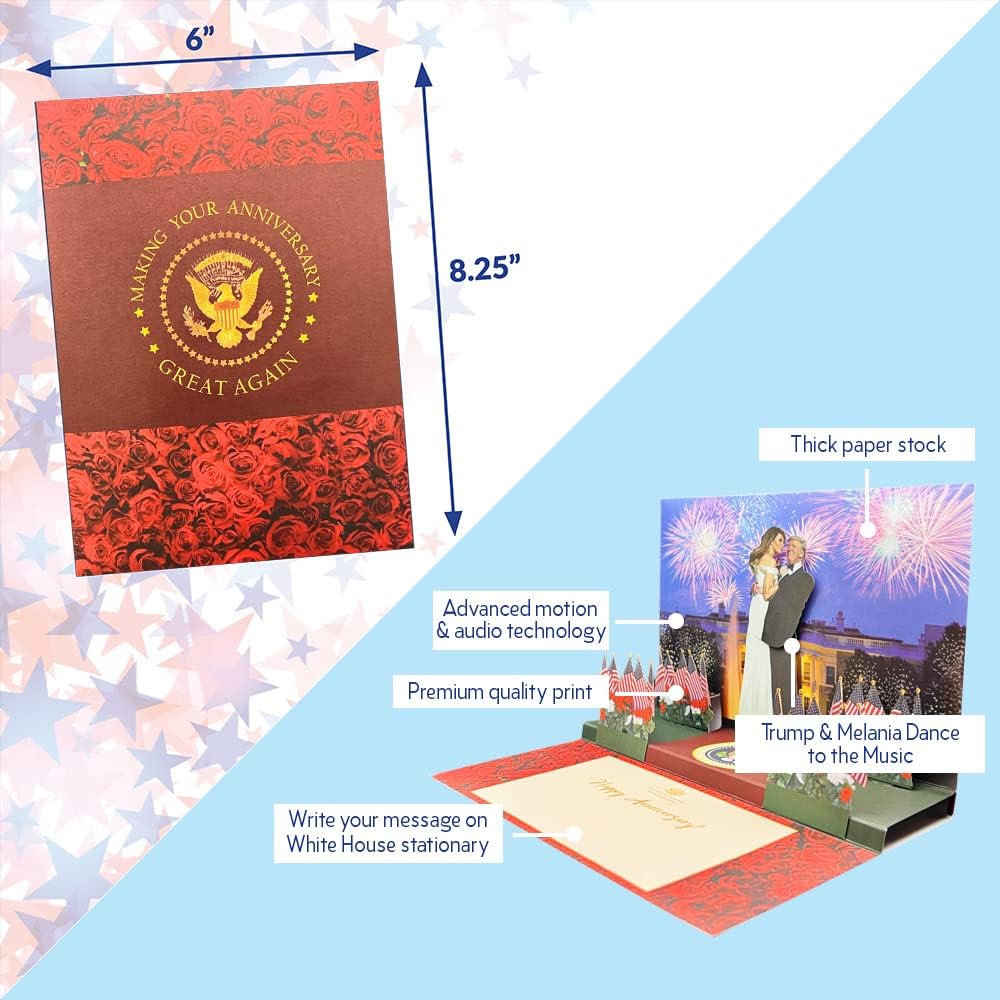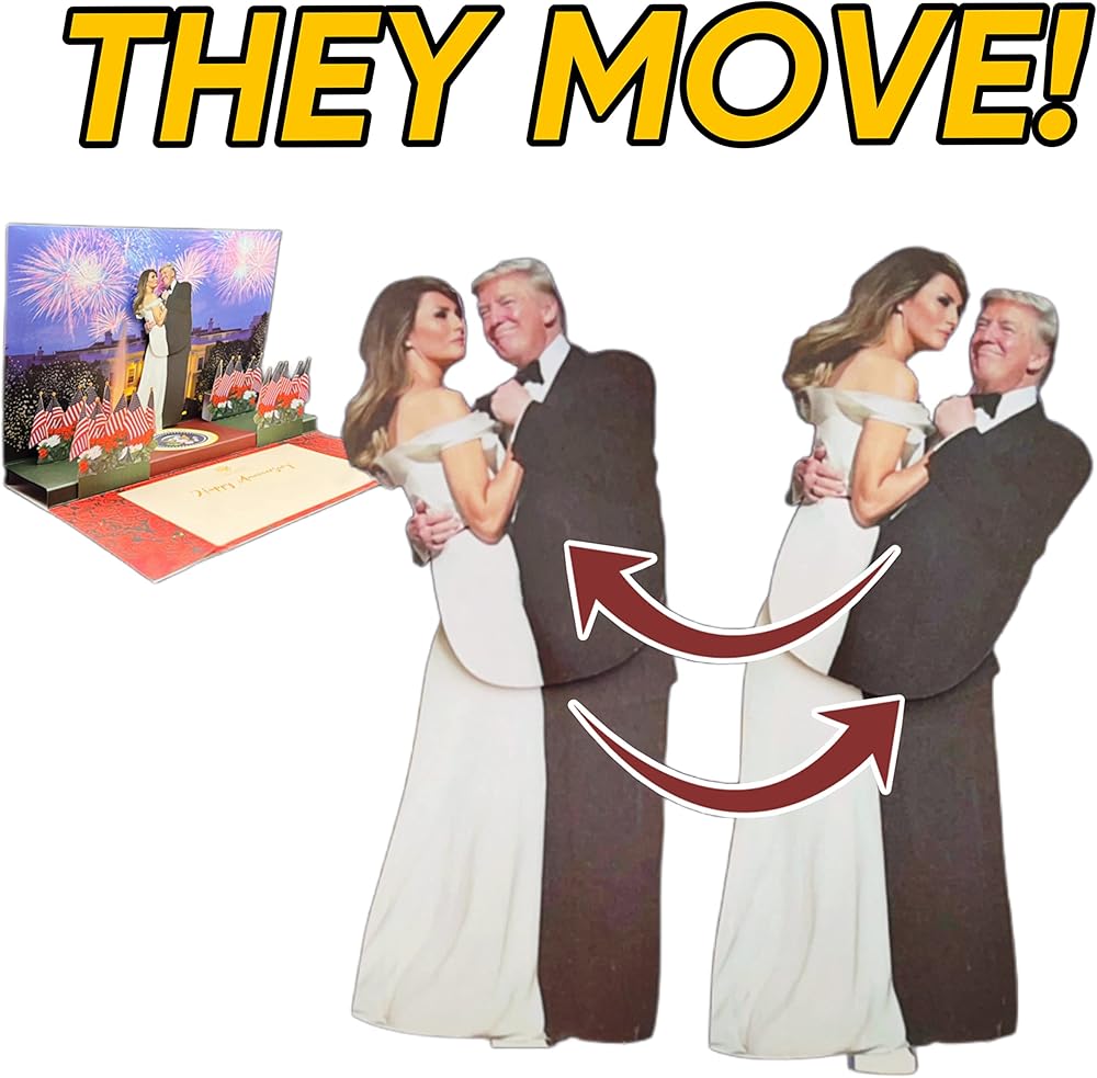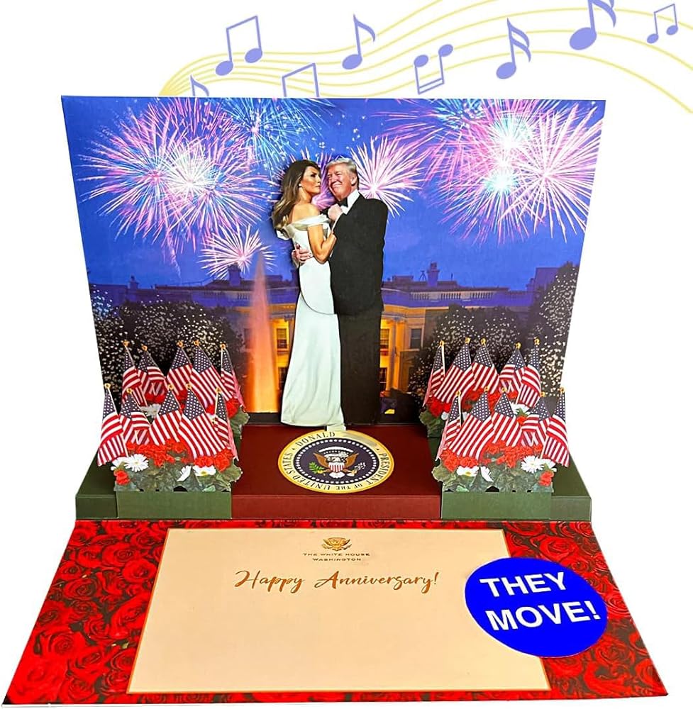 𝐓𝐇𝐄𝐘 𝐂𝐎𝐌𝐄 𝐓𝐎 𝐋𝐈𝐅𝐄 & 𝐃𝐀𝐍𝐂𝐄 𝐁𝐄𝐅𝐎𝐑𝐄 𝐘𝐎𝐔𝐑 𝐄𝐘𝐄𝐒! Our Popup Trump Anniversary Card features the President & First Lady dancing romantically, swaying back & forth to the music on the white house lawn w/ fireworks in the night sky.