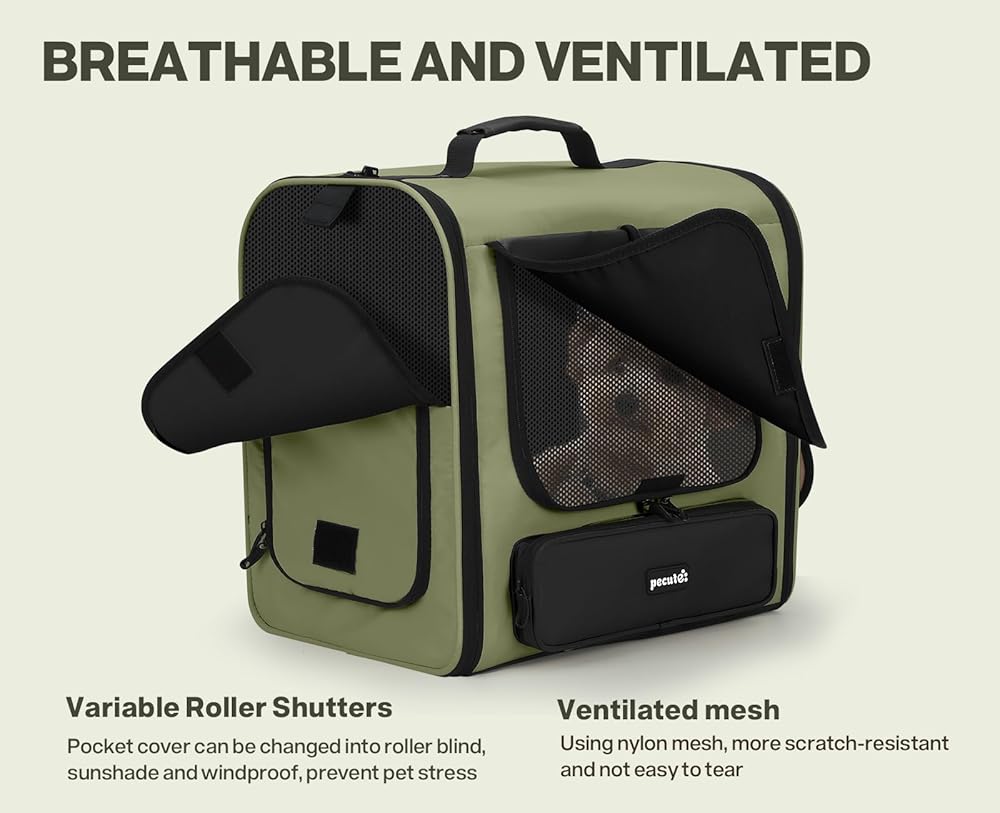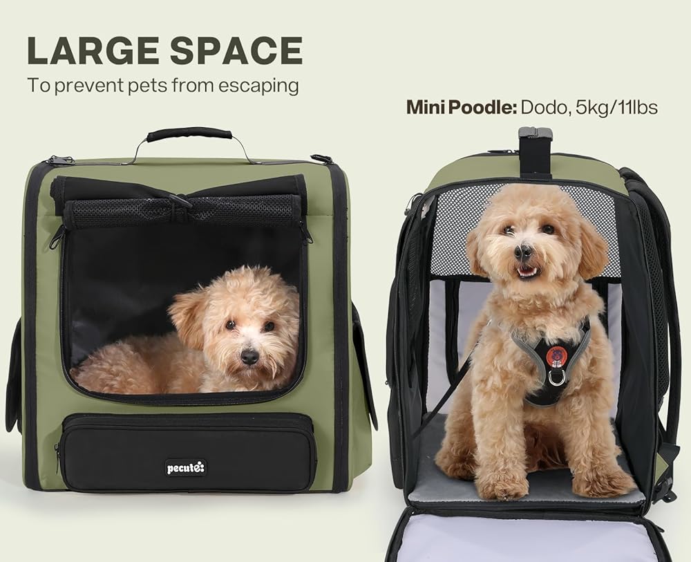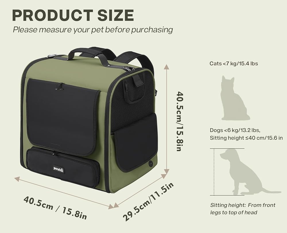 Pecute Spacious Cat Carrier Backpack, Lightweight Ventilated Pet Backpack for Anxious Cats & Small Dogs (Miniature Dachshund), for Hiking Camping Travel Vet Visits, Dark Green