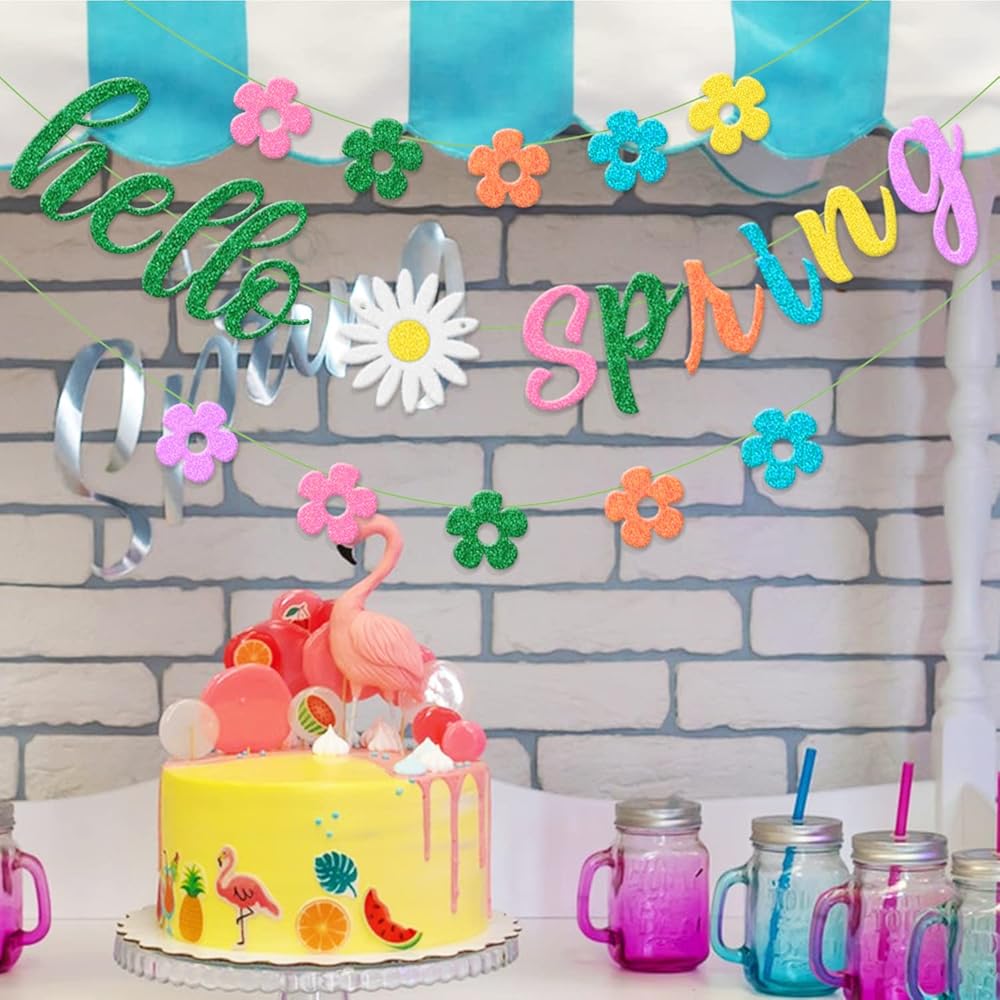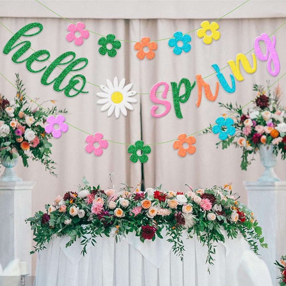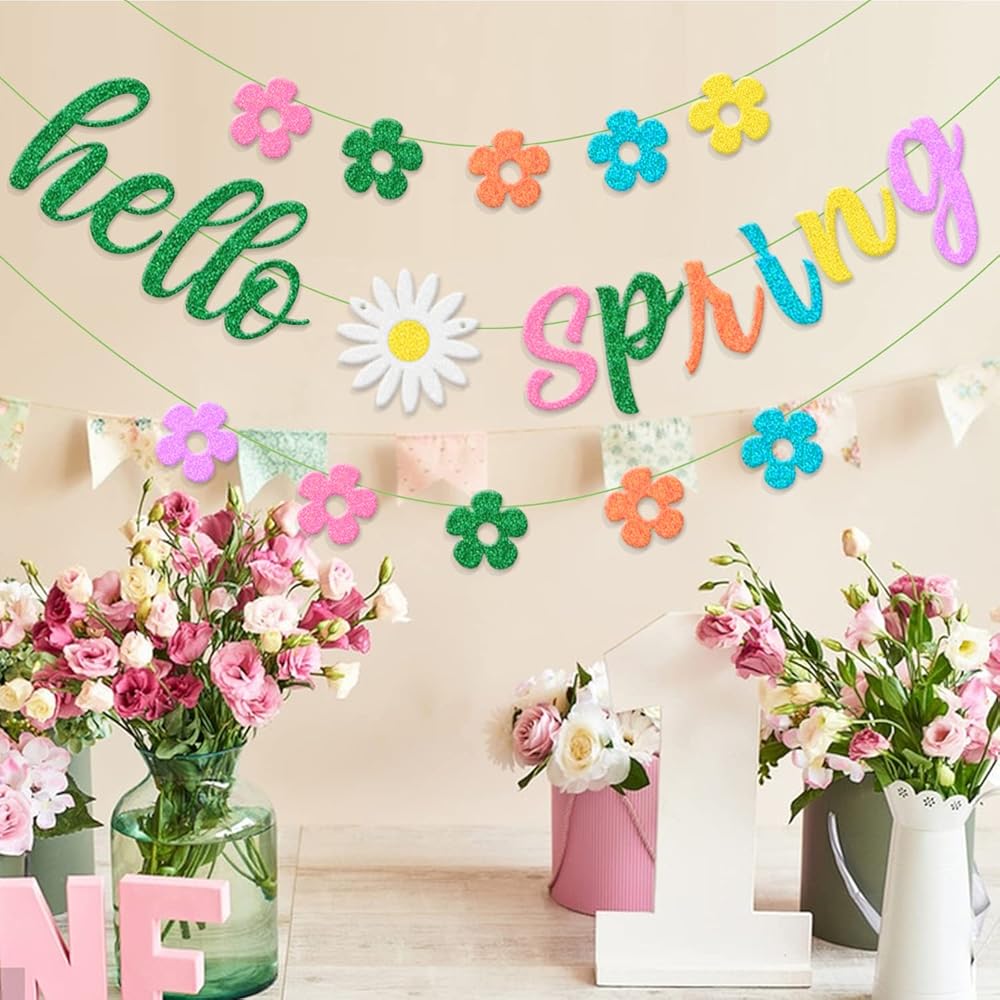 Package Includes: 1Pcs colorful "Hello spring" banner with daisy flower, 1pcs colorful glitter flowers garland, perfect for spring or Easter celebrating party decorations