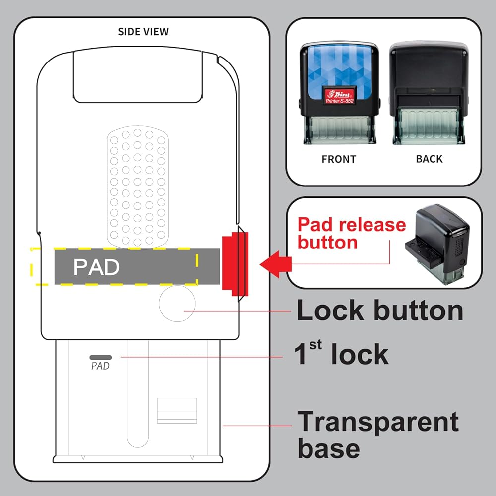 Easy Pad Release: The push-button pad release ensures re-inking your stamper is a breeze; simply apply the side lock buttons and push the red button to release the stamp pad