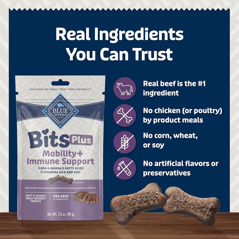 IMMUNE SUPPORT: BLUE Bits Plus soft and chewy dog treats contain Vitamin A, Vitamin E, and Zinc for immune support