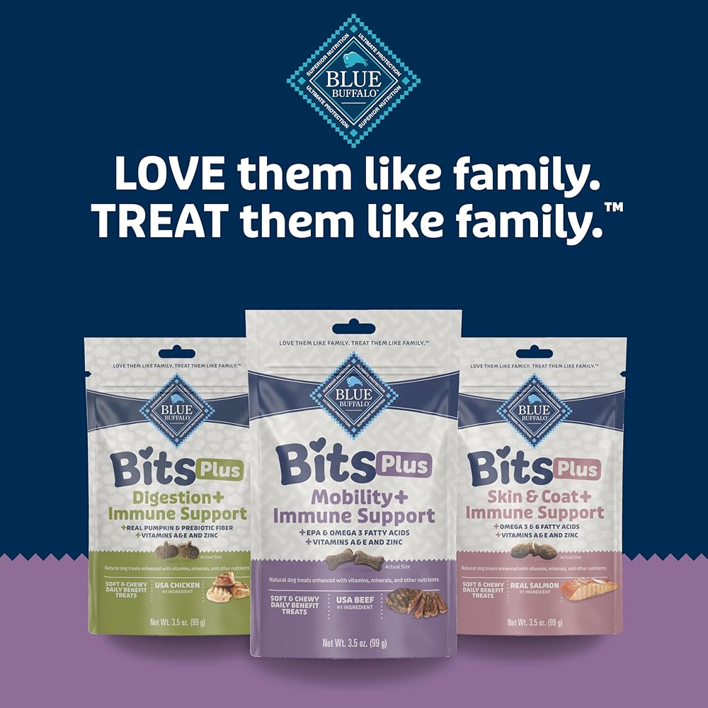 INCLUDED IN PACKAGE: Contains one (1) 3.5-oz. Bag of BLUE Bits Plus Skin & Coat and Immune Support Soft and Chewy Dog Treats, Salmon