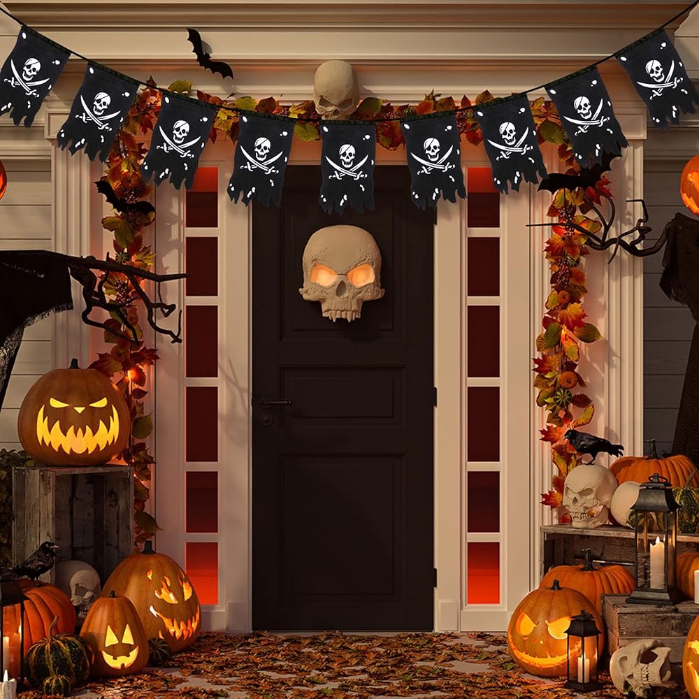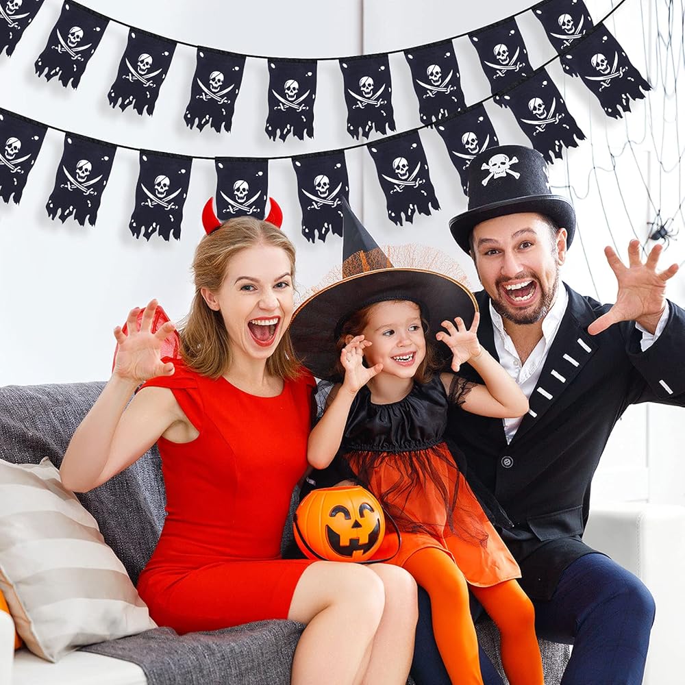 Tatuo 90 Feet Long Pirate Flag Banner Pirate Party Decoration Supplies Vertical Skull Bones Jolly Roger Crossbone Flag for Halloween Party Decor(Classic Style)