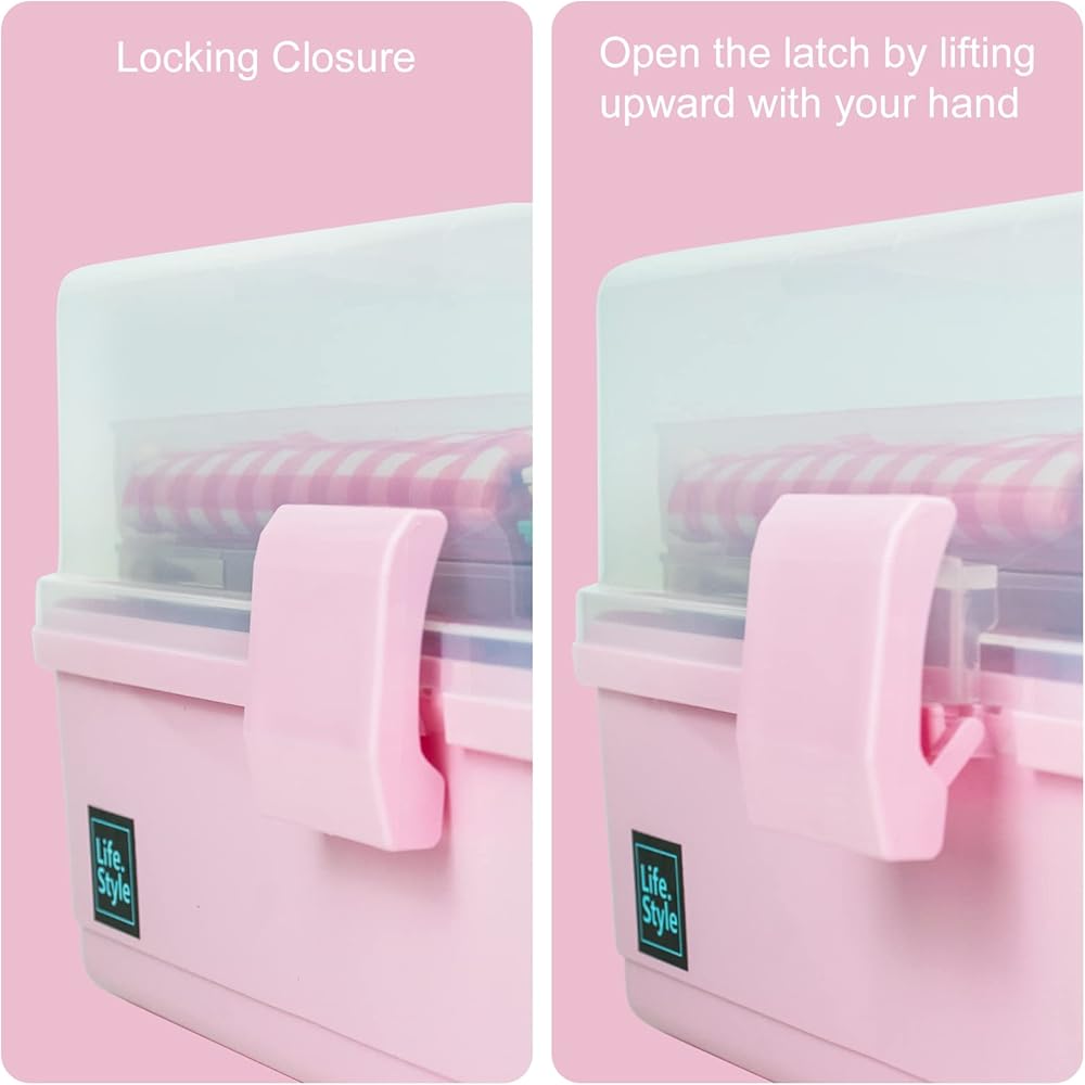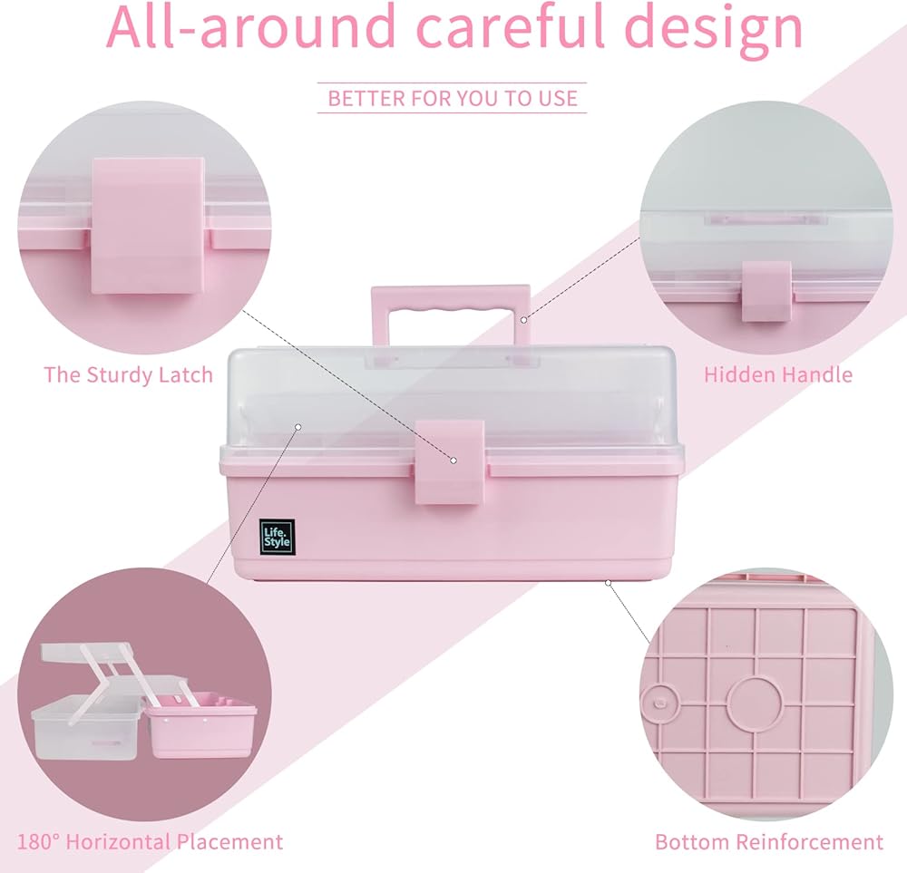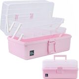 Creahaus 13 inch Art Craft Organizer Storage Box with 3 Layers, Multifunctional Plastic Tool Box with Handle for Sewing, Makeup, Medicine, Nail, Hair Accessories for Kids (Pink)