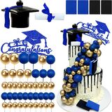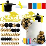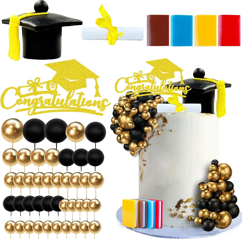You will get 50 cake toppers, 1 cake topper, 1 graduation cap, a scroll, 4 books and 43 decorative balls, of which the scroll and book are required to DIY
