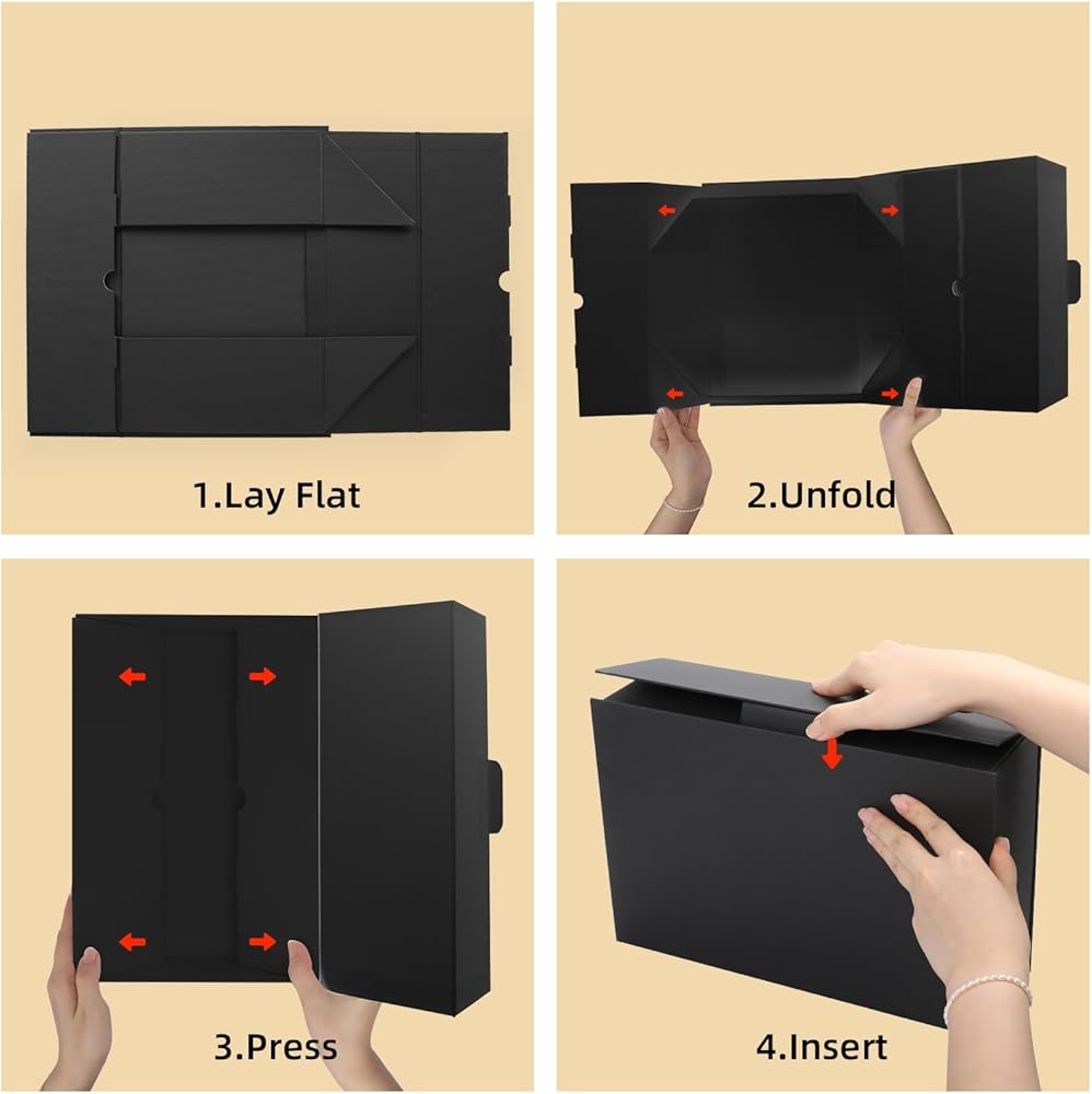 Easy To Assemble: Rectangular collapsible gift box with lid for easy opening and closing. Quick assembly, no extra tape required, easy to fold together in 3 steps, just lay flat, then press 2 cardboard into the box,last insert the closure.Save your valuable time and effort.After you use it, gently lift the cardboard sheets and the box will return to its original shape.