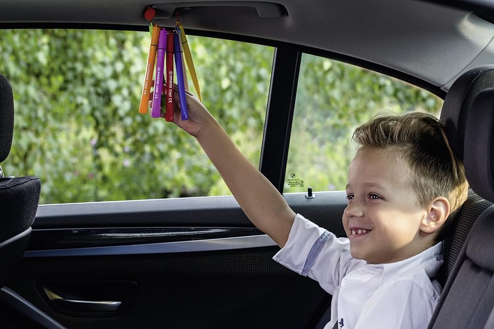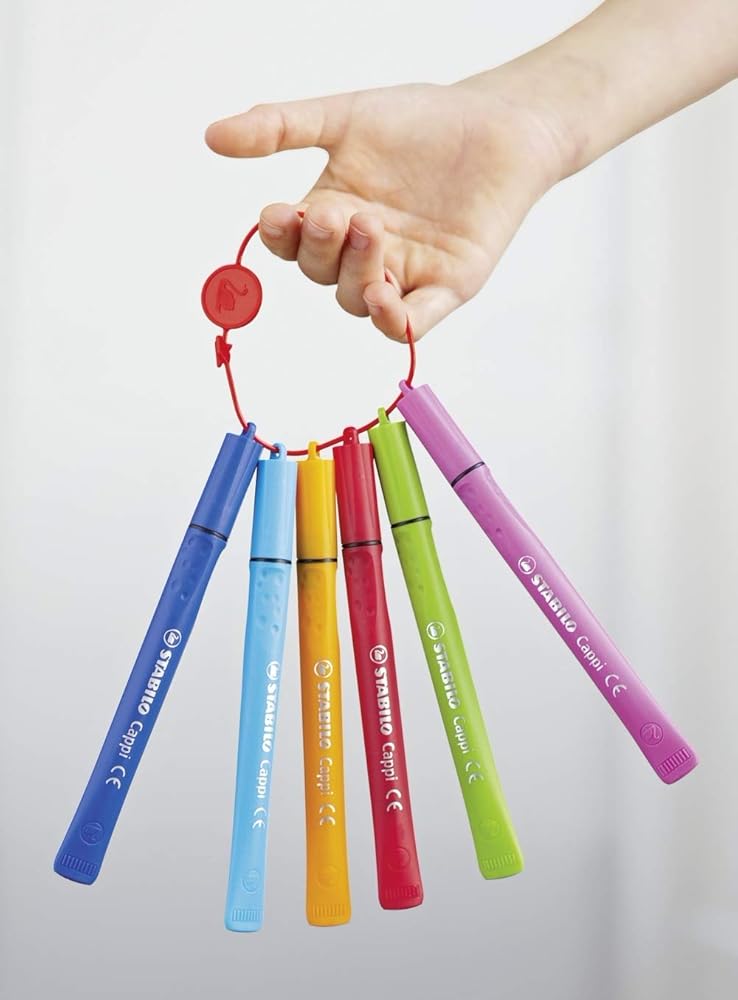 Stabilo 24 assorted Cappi are wonderful vibrant coloured felt tip pens to create pictures in school and at home. The ergonomic grip zone ideally designed for children's hands and the unusual tube shape is designed so the pen doesn't roll away and can be easily picked-up. Each pen has a loop on the cap so the pens can be threaded onto a cap-ring making it's almost impossible to lose them. The pens are ideal for children age 6+, easy washable ink, a writing line of 1mm, ventilated cap (Can be left uncapped for up to 24 hours without drying out).