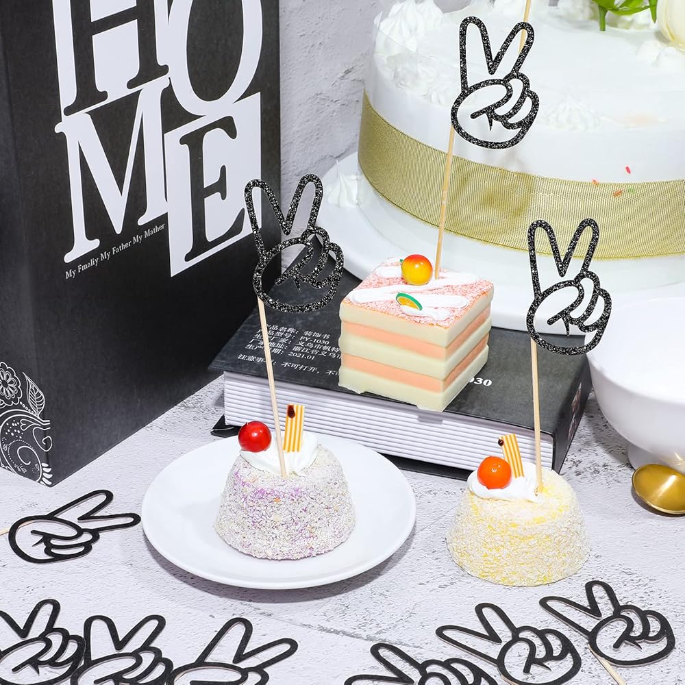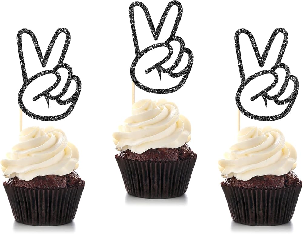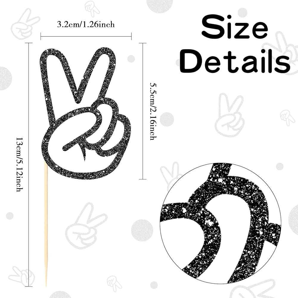 Spakon 24 Pcs Peace Sign Cupcake Toppers Glitter Peacekeeper Cupcake Pick Peace Hand Sign Cake Decor Two Cool Birthday Party Decoration for Two Groovy Carnival Theme 2nd Birthday Party Supplies(Black)