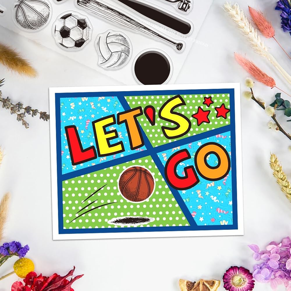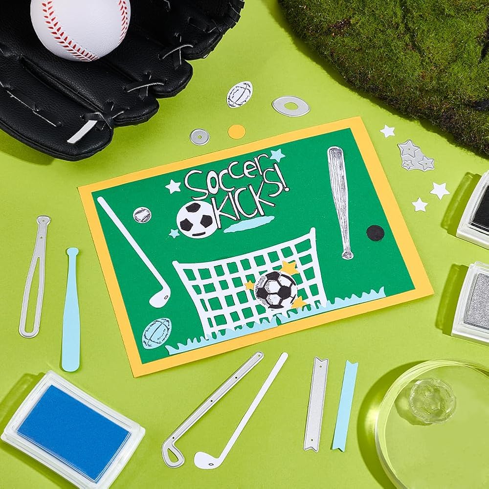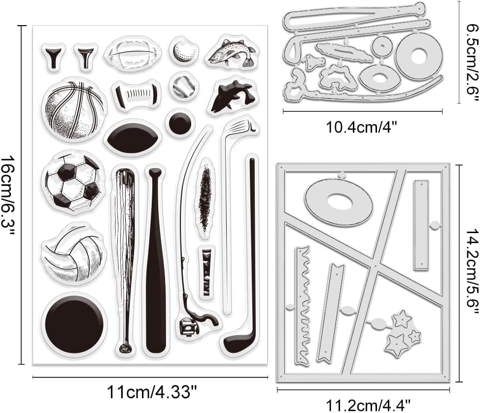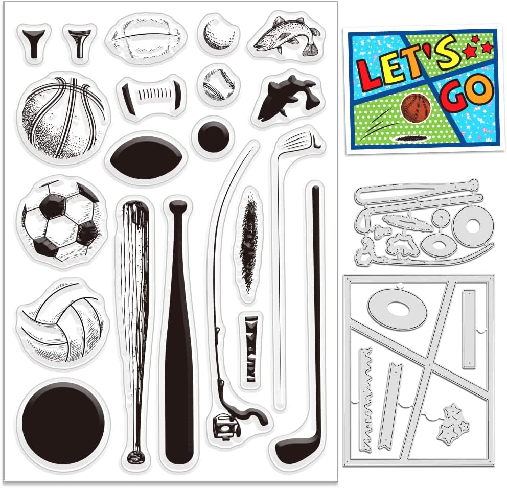 PACKAGE INCLUDE: Including 1 clear stamp and 2 die cuts. The Sports Stamps and Dies for Card Making with various sports equipment patterns, such as football, basketball, baseball, golf and golf clubs, volleyball, rugby, fishing and fishing gear, grassland clear stamps and frame, star, grassland die cuts, and more. Can meet your needs. Perfect for you DIY craft.
