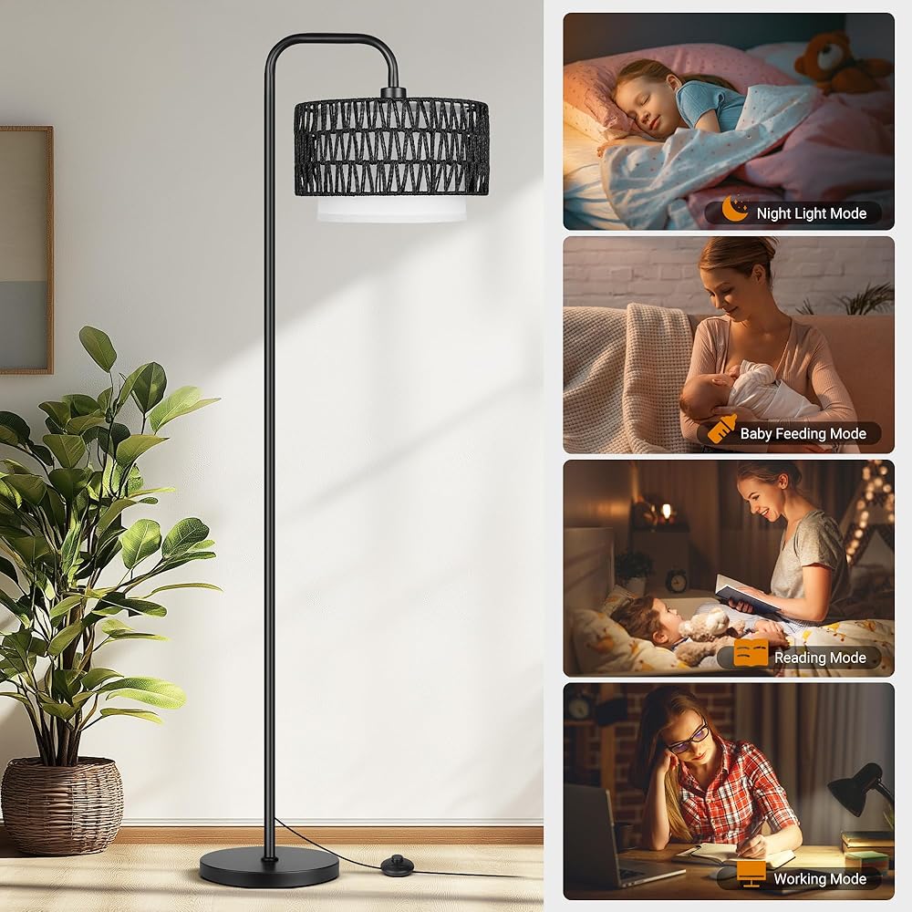 Stylish Decor : Floor lamp comes with 2 removable lampshades, a 100% hand-woven grey rattan shade and a fabric linen shade. Its farmhouse and contemporary design effortlessly complements various decor styles, adding a touch of sophistication to your space. The 2 in 1 rattan & fabric shades design not only provide exceptional lighting, but it also serves as a stylish centerpiece in any room, whether you place it in living room bedroom office or any other area, it'll create a comfortable atmosphere.