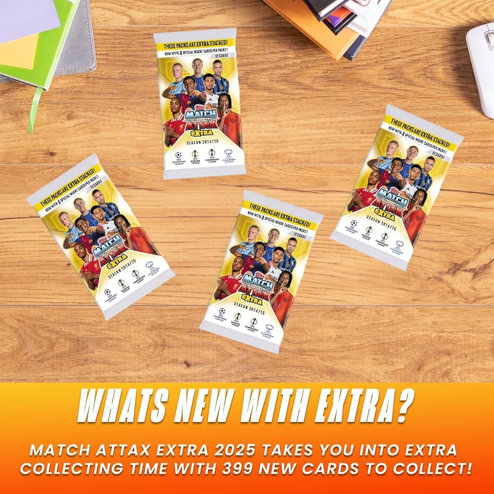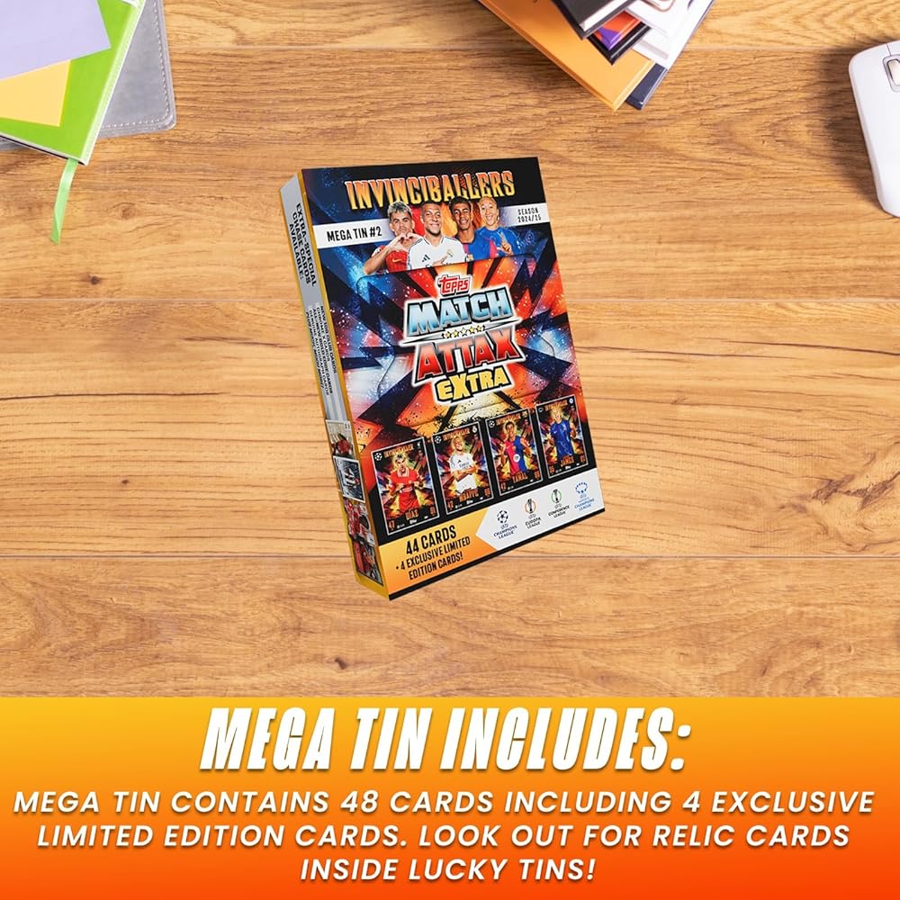 Unleash the ultimate football card collection with the Topps Match Attax Extra 2024-2025 Soccer Cards Random Mega Tin! This premium tin includes 48 cards, featuring 4 exclusive Box Office Baller Limited Edition cards, making it a must-have for any serious collector. Packed with top players, exciting inserts, and rare finds, this tin adds a new level of excitement to your Match Attax collection. Whether you're chasing limited editions, trading with friends, or completing your set, this mega tin delivers unmatched value. Plus, keep your best pulls in pristine condition with 100 card protector sleeves included in this bundle. Perfect for collectors of all levels, this tin is your ticket to building a powerhouse Match Attax squad. Grab yours today and take your collection to the next level!