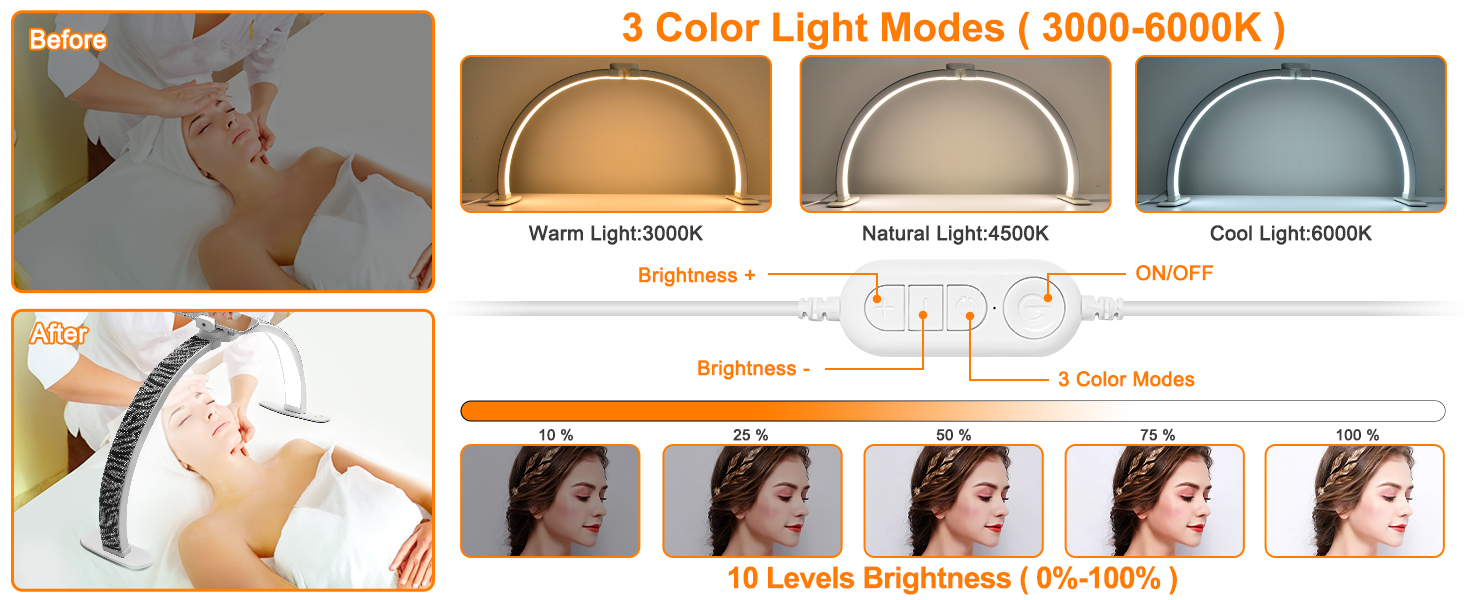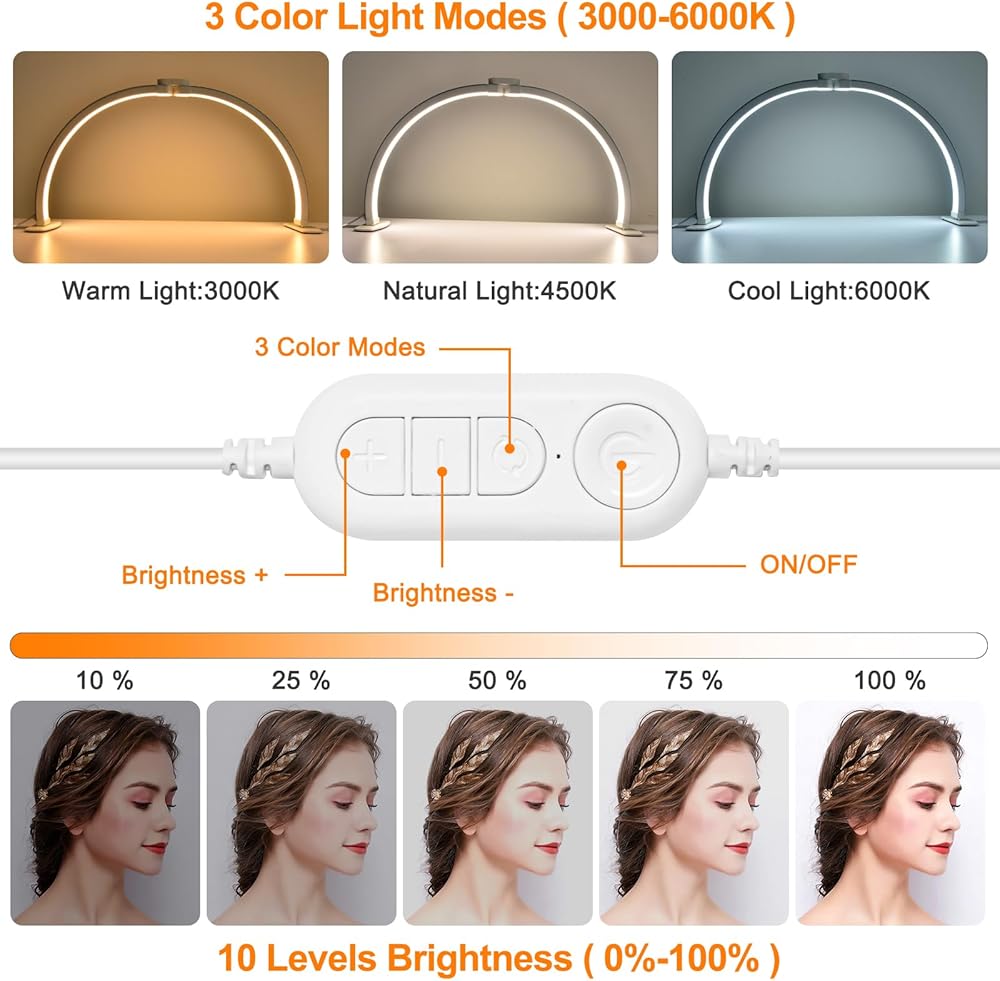 3 Color Light Modes and 10 Brightness: Our half moon light for lashes is made with 364 LED beads, offering adjustable brightness and color temperature. It features 10 dimmable levels (10% - 100%) and 3 color temperatures (3000K - 6000K). Easy-to-use controller allows you to adjust the settings according to your needs. Whether you require bright light or soft light, the half moon lamp can easily meet your requirements. (Note: This is a lighting lamp, not a UV nail lamp)