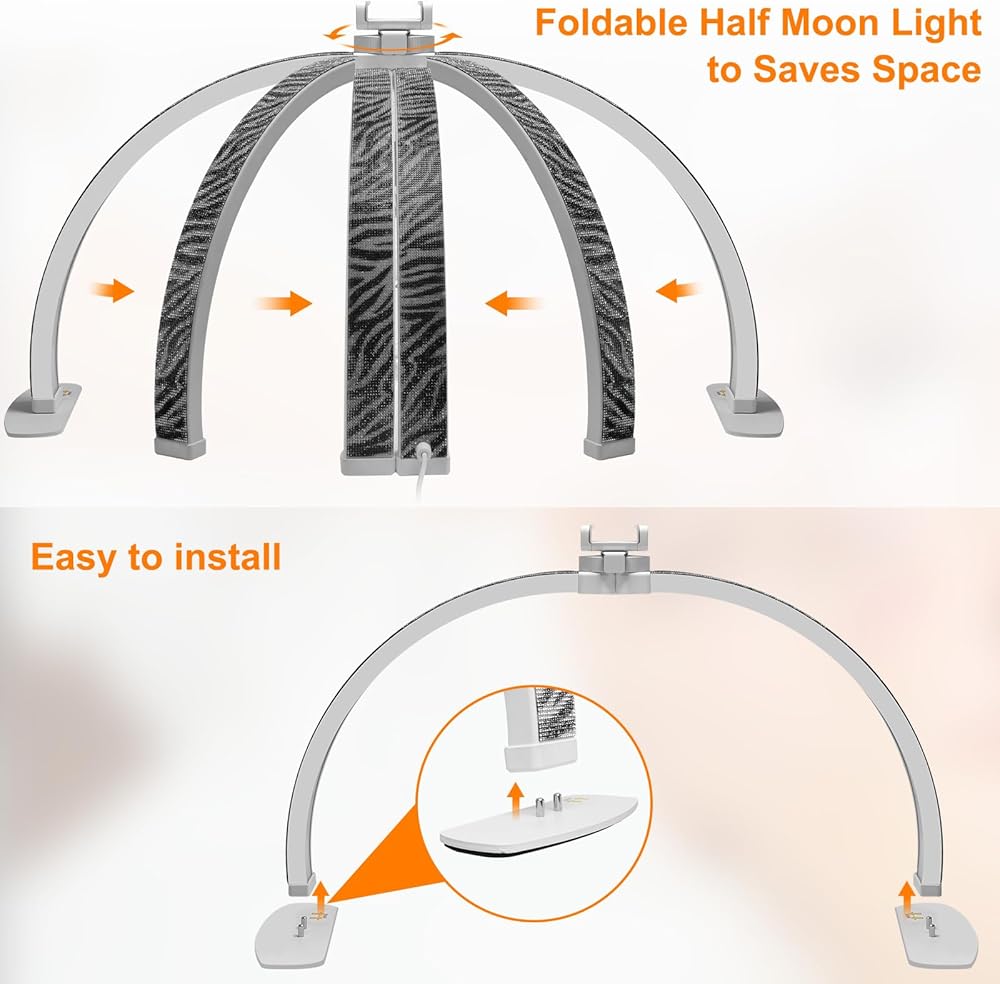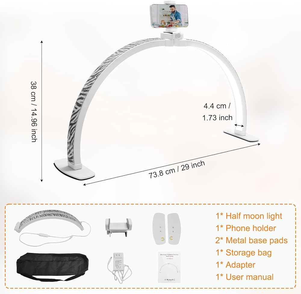 Wide Application: The half moon led light is not only ideal for professional nail technicians and esthetician but also suitable for professional facials, eyelash extensions, tattoos, DIY crafts, makeup videos, live streaming, and online teaching lighting. The package includes: 1*zebra-patterned half moon light, 1*phone holder, 2*metal base pads, 1*storage bag, 1*adapter and 1*user manual