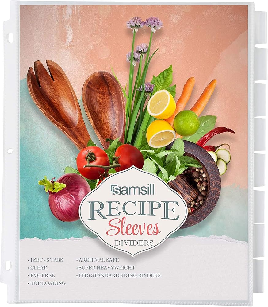 Customize your own recipe book with this set of 8 tabbed Recipe Divider Sleeves combine the benefits of a Sheet Protector with the organizing powers of tab dividers. Samsill's 8 Tab Sheet Protector Dividers fit any standard 3 ring binder. Made from Super Heavyweight clear polypropylene (5mil in thickness), these recipe binder dividers allow you to see your cookbook categories easily and keep them safe from spills and splatters. Our high quality, top-loading dividers are made from PVC-free and acid-free materials, ensuring your recipe book is safe for generations of use. Each divider is large enough to fit 8.5" x 11" letter size papers, visible from the front and back. Each individual divider has a clear tab, and this set includes 26 white paper label slips, perfect for instant customizing. Make your own recipe book! Look for Samsill's Recipe Sleeves, 4" x 6" Recipe Cards, and beautiful 3 ring Recipe Binders for a recipe book that's completely customizable! At Samsill we pride ourselves on creating and innovating home storage solutions in the market. We're a family owned company, based out of Fort Worth, Texas, for over 65 years. If our product does not meet your expectations please let us know and we will do everything we can to make it right.
