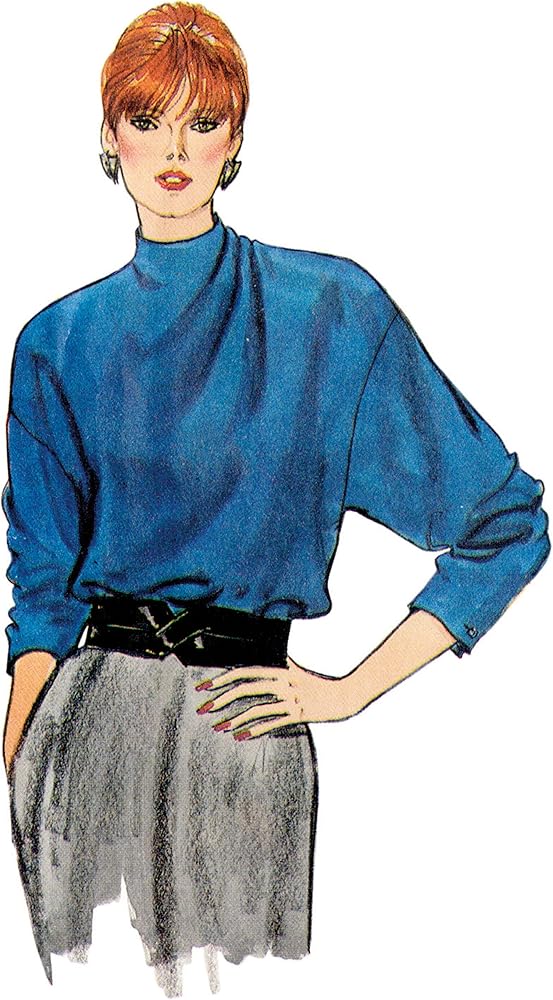 Very loose-fitting, pullover blouse has bias draped front, dropped shoulders, back neckline slit with buttons and loops, short or long sleeves with buttoned pleat at lower edge (push up), and narrow hem.