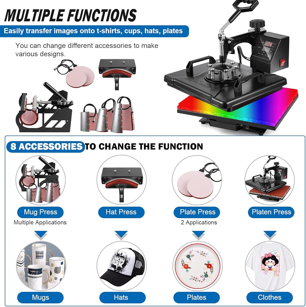 👘 5 In 1 Combo Heat Press Machine -- 5 in 1 Heat Pres Machine include: 12x15 Heat Press Machine for Tshirt x 1pc ; 5.5"x 3" Hat press x 1pc ; 11oz Mug press x 1pc; 5" Plate Press x 1pc ; 6" Plate Press x 1pc. This heat press comes with a 3-year warranty. Lifetime technical guidance and support. Any problem, contact with us on Amazon message, customer service will reply in 12 hours.