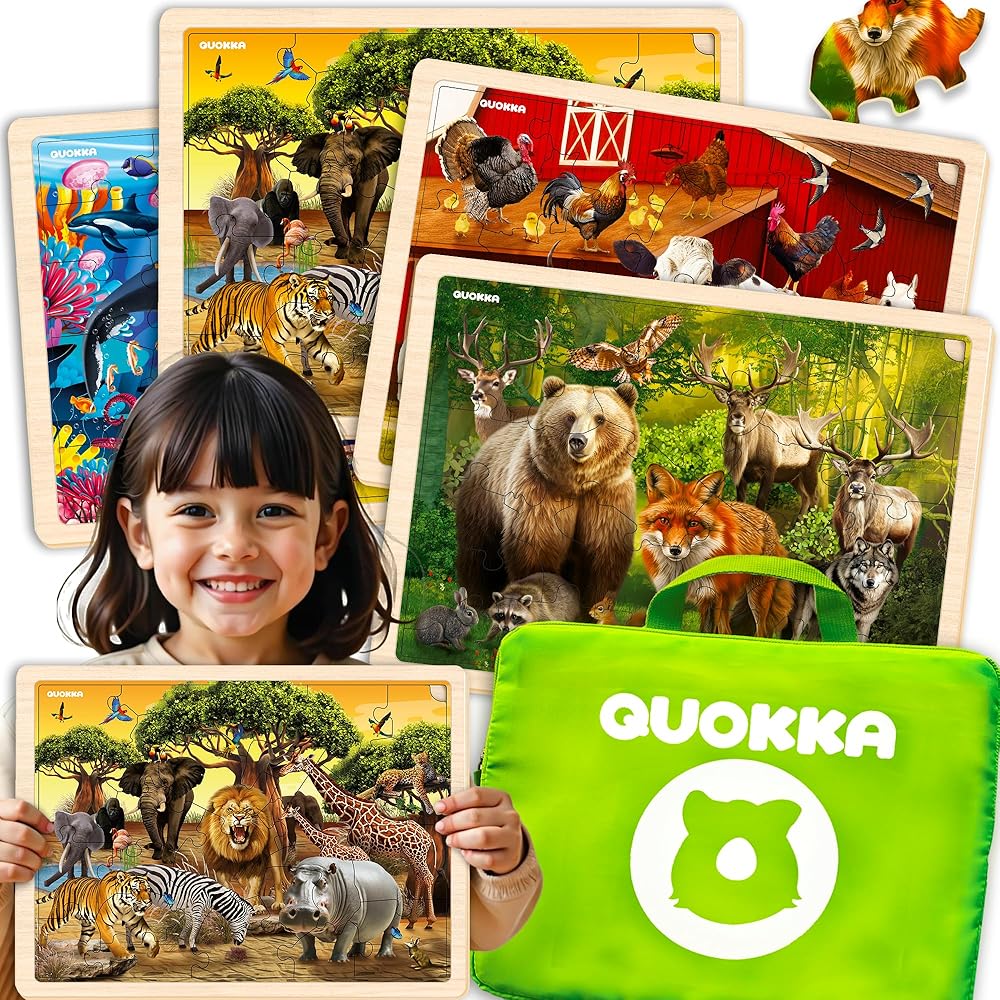 SET OF 4 WOODEN PUZZLE: 24 big piece puzzles for 3-8 year olds measure themselves 11,81x8,66 inches; These inset jigsaw puzzles with animals for preschool toddlers and kids ages 6-8 come with a branded QUOKKA bag for convenient storage