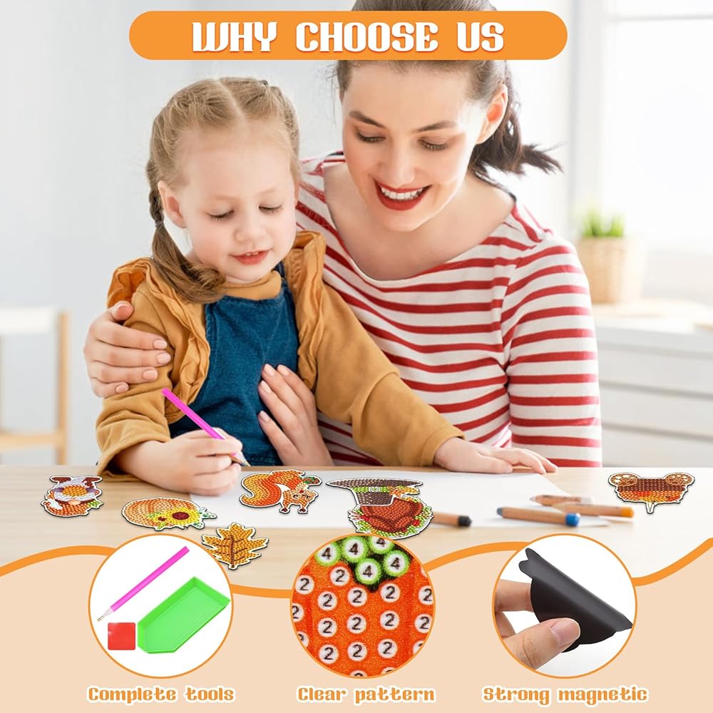 BEGINNER FRIENDLY KIT: The mini diamond painting kit is easy to operate and suitable for all kinds of craft enthusiasts, all you need to do is to tear off the film of the refrigerator magnet, follow the number on the magnet to find the corresponding gemstone packet, pour the diamonds into the tray, and then add the clay on the pen to glue the diamonds to the corresponding position. Enjoy a relaxing DIY craft time and experience the fun of creation with your family