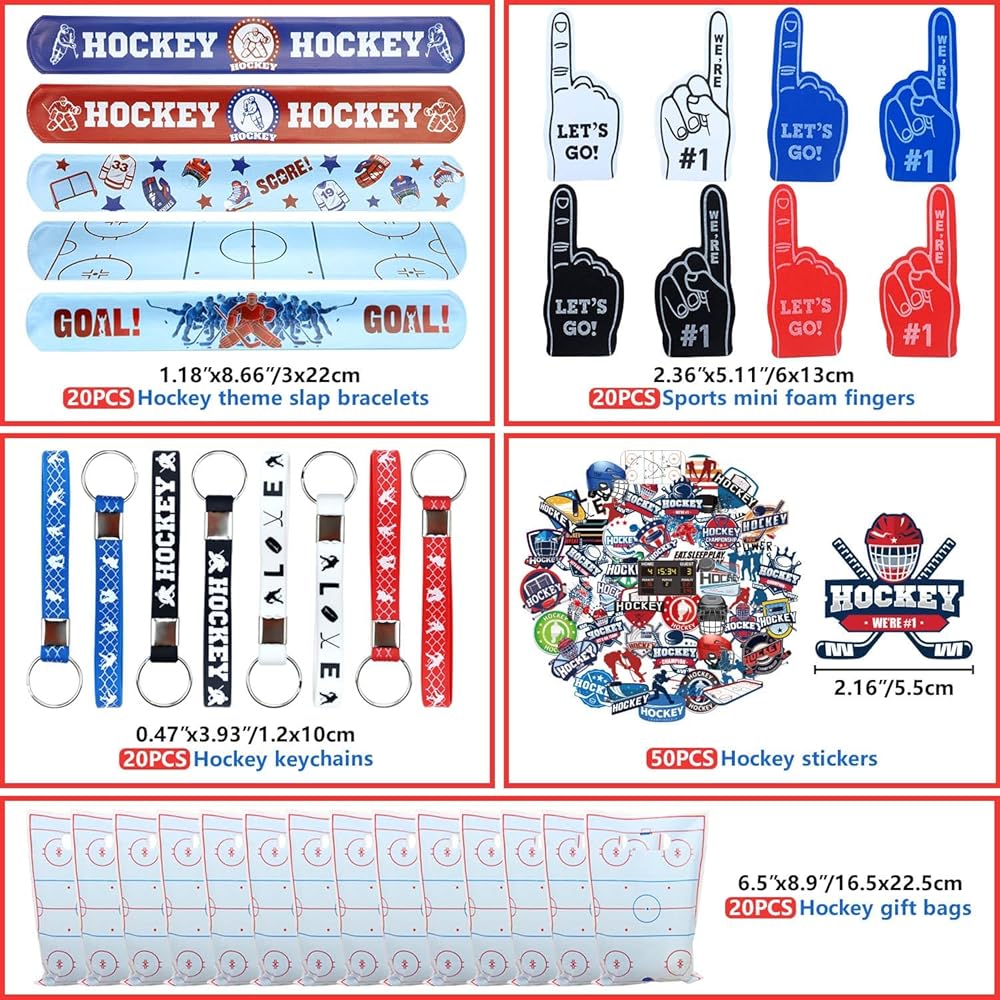 Hockey Party Decoratioons Package Includes: Hockey keychains x 20, ice hockey gift bags x 20, slap bracelets x 20, hockey theme stickers x 50, sports mini foam fingers x 20. This comprehensive set includes everything you need to delight hockey fans and birthday party guests alike.