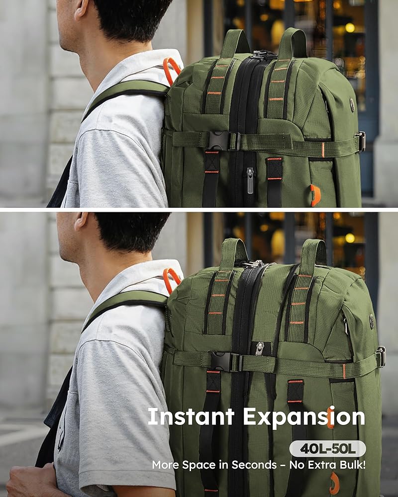 ✅【Expandable 40L-55L for Any Journey】Expand the 40L travel backpack to 55L with dual-compartment main storage, this travel laptop backpack adapts to your needs from daily commutes to 5-day getaways. Large separate dry-wet compartments keep gym gear, toiletries, or damp clothes neatly organized. Whether you're packing light or loading up, this versatile travel bag ensures everything stays in place, making it your perfect travel companion