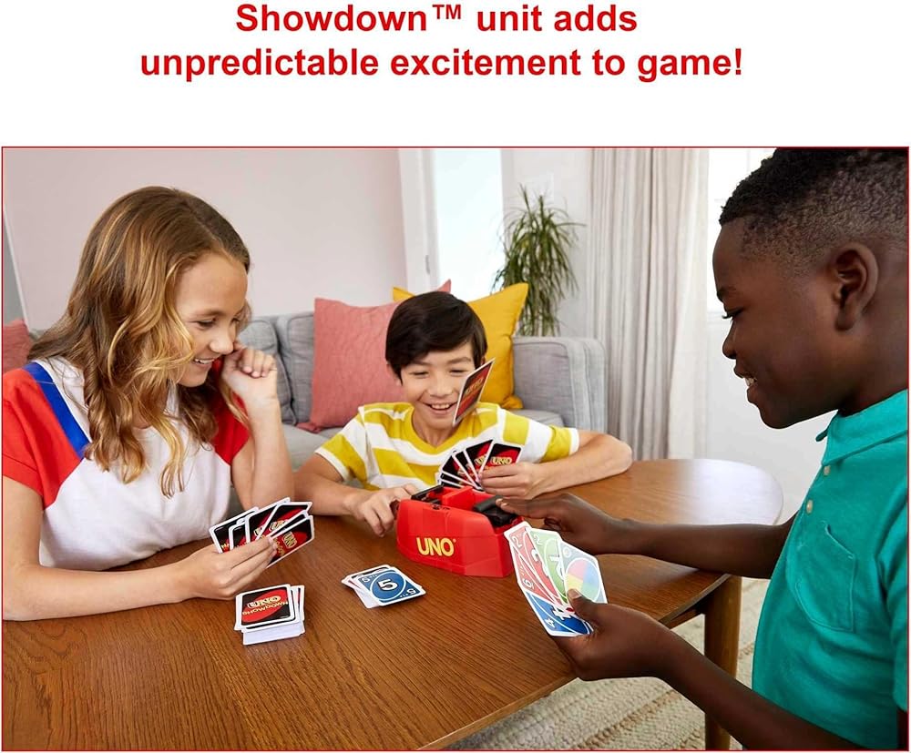 Experience UNO Showdown it's the UNO game everyone already loves but with unexpected excitement from the Showdown unit! Be ready when the UNO Showdown unit signals, it's time to pull off a speedy reaction and push the pedal so cards go flying at opponents! Everybody duck! As in classic UNO , players race to get rid of all their cards by matching a card in their hand with the current card shown on the top of the discard pile. When players are down to one card, they must remember to yell "UNO!" Surprise-filled fun for family game night accommodates 2 to 10 players ages 7 years and older.