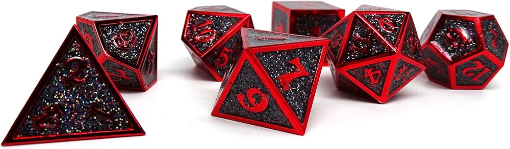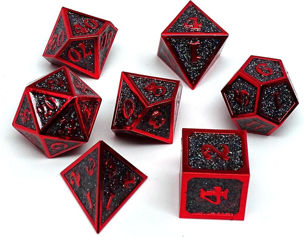 Each set of metal polyhedral dice includes seven of the standard polyhedral dice for tabletop gaming. Included in this item is one D20, one D10, one D8, one D6, one D4, and one D00 - which is a ten sided percentile dice. The Heroic Dice of Metallic Luster Series was launched on Kickstarter, and offers a unique sparkle look to these bordered metal dice sets.