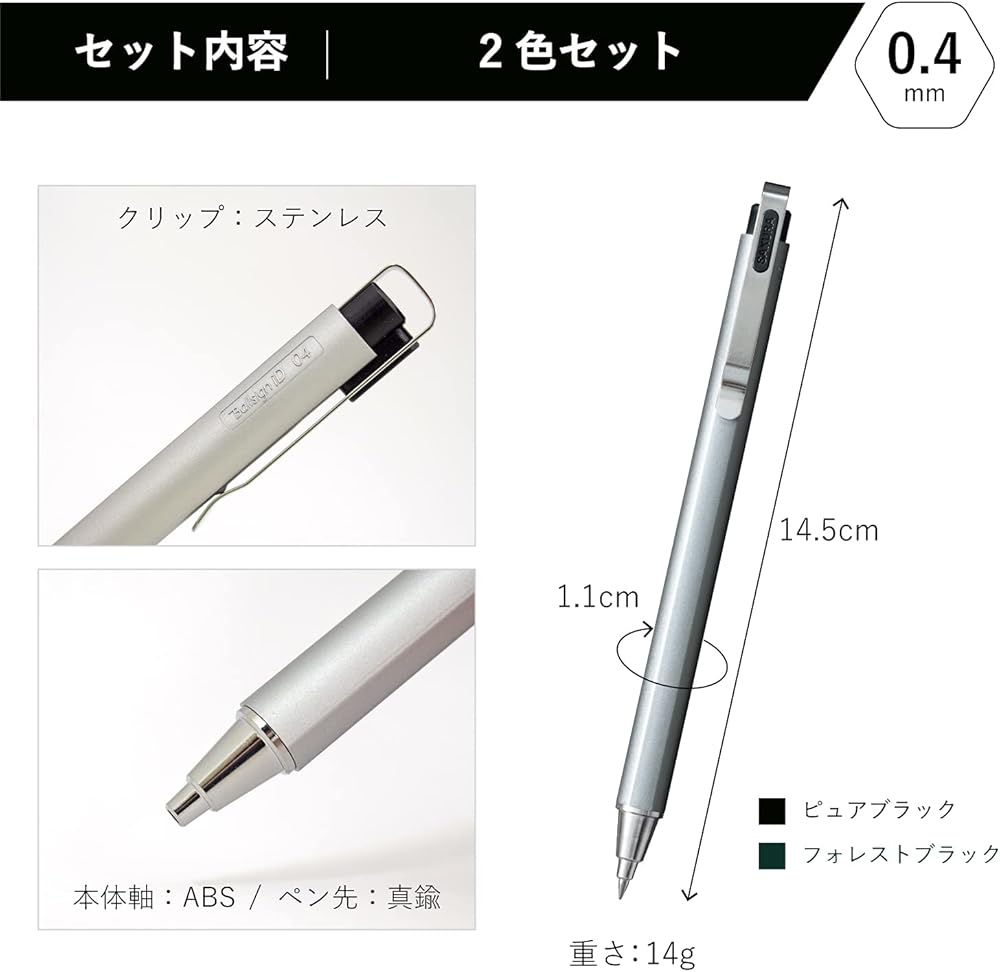 The shiny silver clip gives it a high quality design. 0.4mm silver one tone from clip to tip 0.5mm with contrasting black and silver