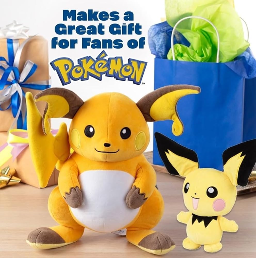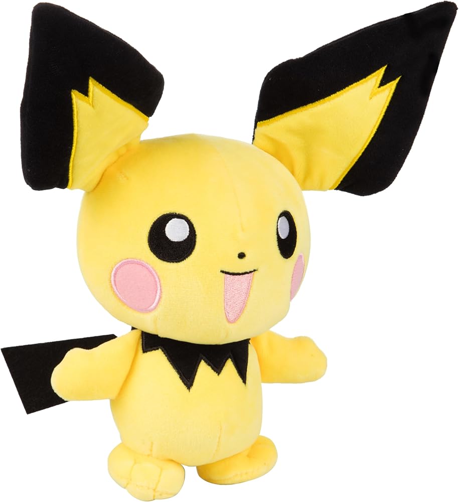 Evolution set! Cute and cuddly 8" Pichu and12" Pikachu Pokemon Plush Stuffed Animals are a must have for all Pokemon fans! This super soft plush figure is great to take wherever you go! The Pokemon plush toy is iinspired by Pokémon anime, trading cards, Let's Go!, Detective Pikachu, Sword and Shield, Scarlet and Violet, Nintendo video game series and more! Makes a great gift for kids, boys and girls who love Pokemon. These authentic quality plushie figures are perfect gifts for Christmas, birthdays, Easter, holidays, Valentine's Day, stocking stuffer, basket stuffer and more - Your favorite Pokémon character is waiting for you! Officially licensed Pokémon merchandise by Jazwares. Polyester. Ages: 2+