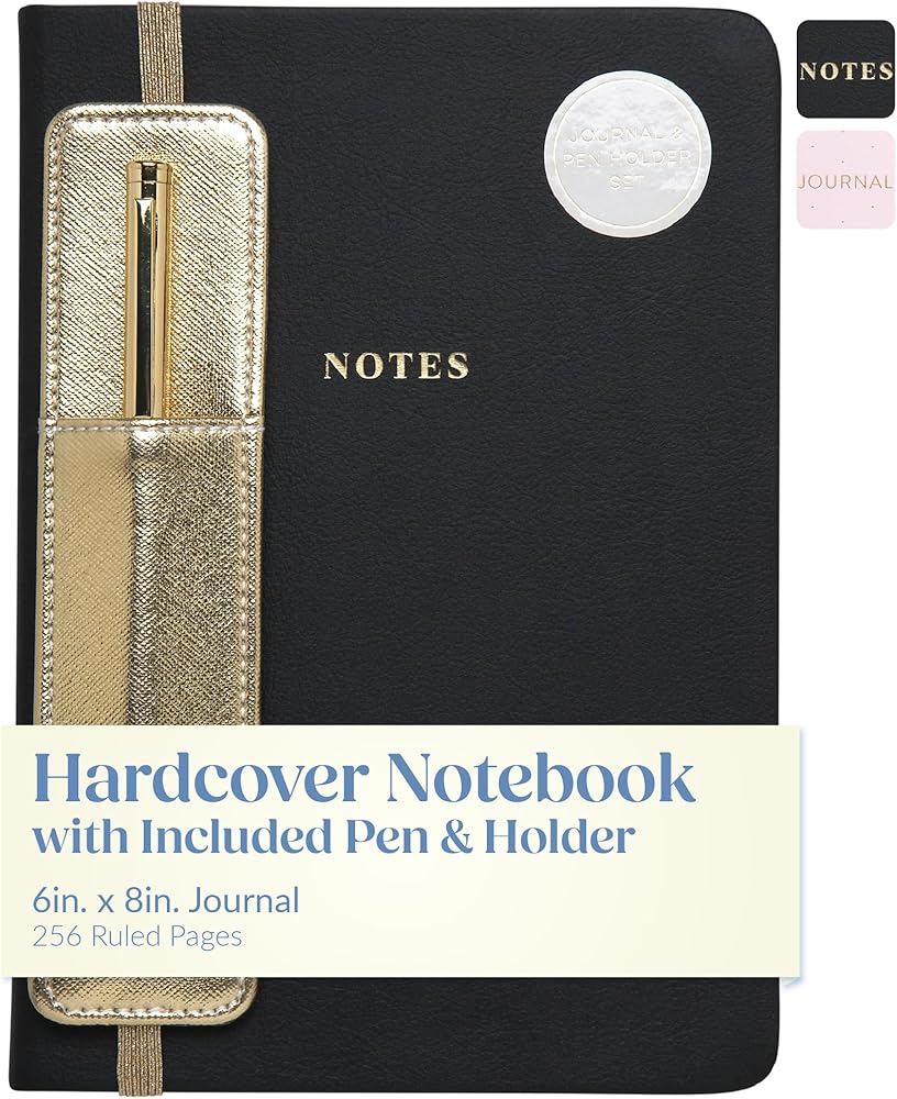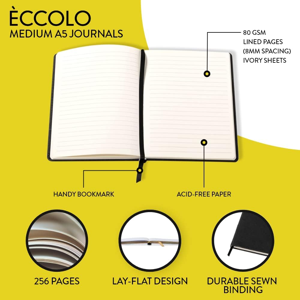WORLD TRAVELER Eccolo Medium Lined Journal Notebook, Hardbound Cover, A5 Writing Journal, 256 Ruled Ivory Pages, Ribbon Bookmark, Lay Flat, Notebook for Work or School, Size 6X8, 6X8 Black with Pen