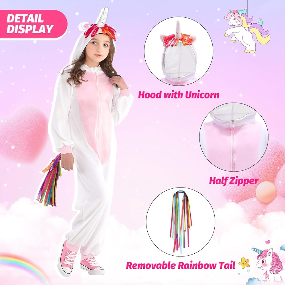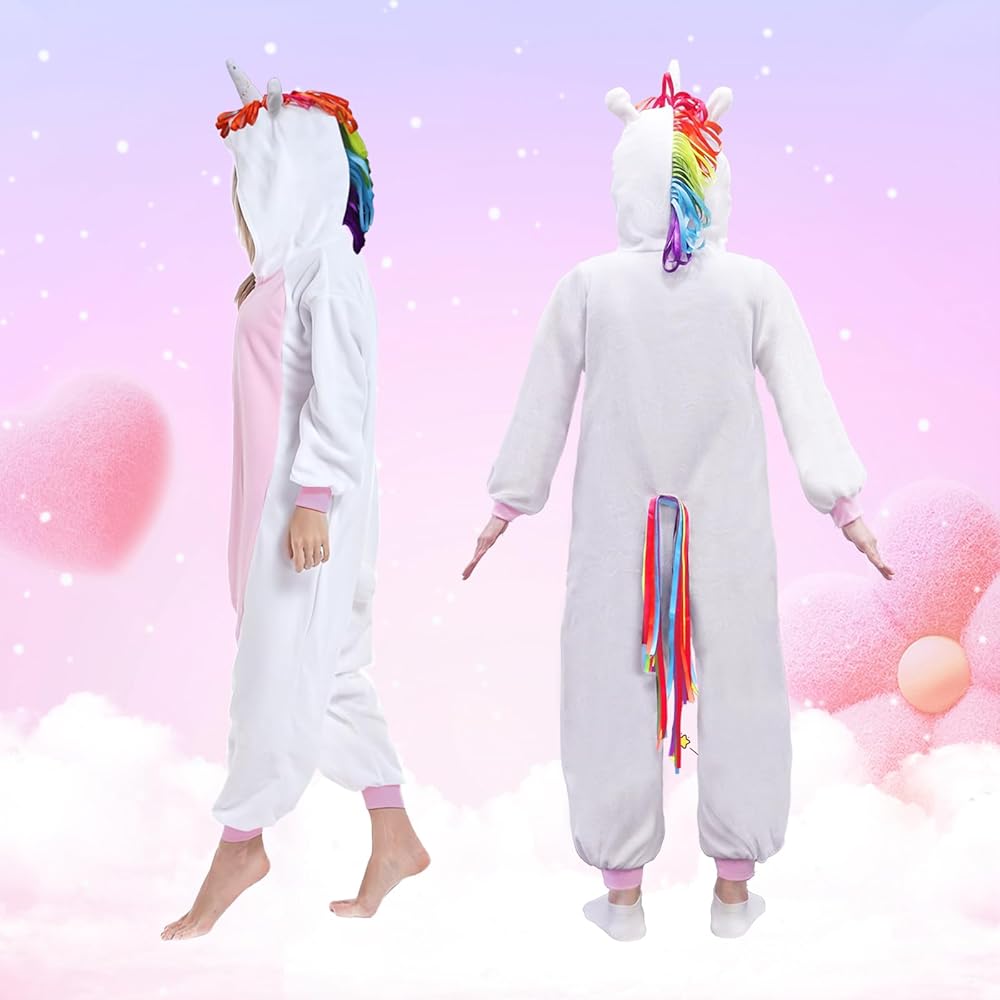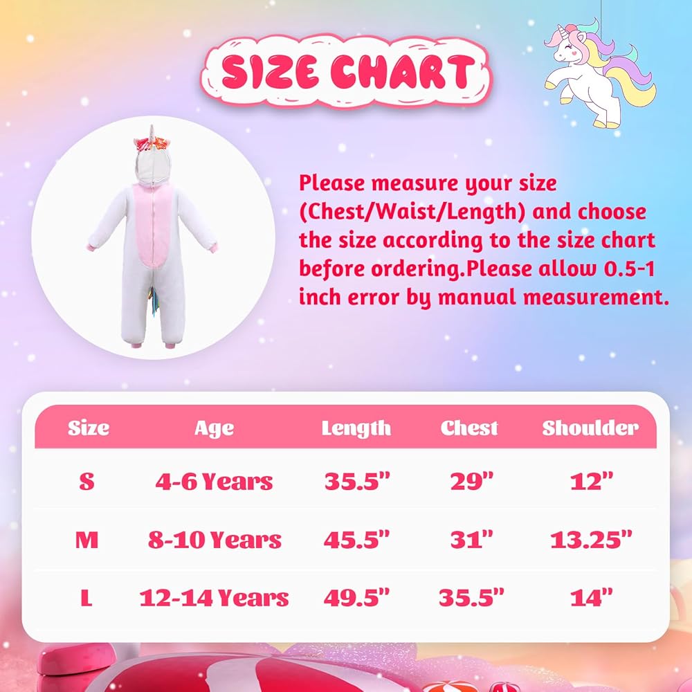 Soft Fabric: The unicorn costume made from quality flannel materials, comfortable, soft, and warm, and the onesie is available in 3 sizes and suits for ages 4-14 years, please refer to our size chart in photos before purchasing.