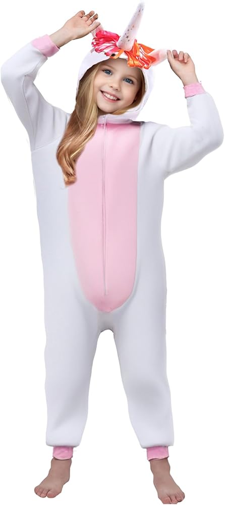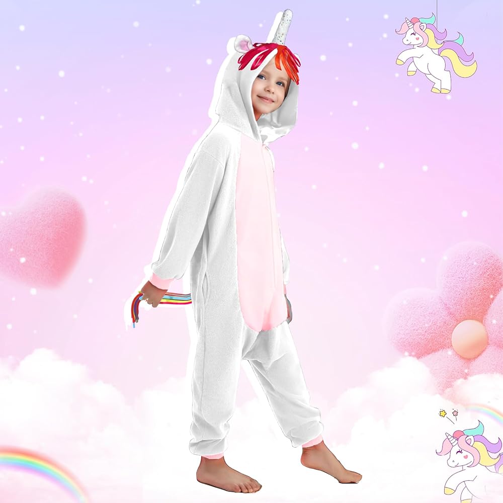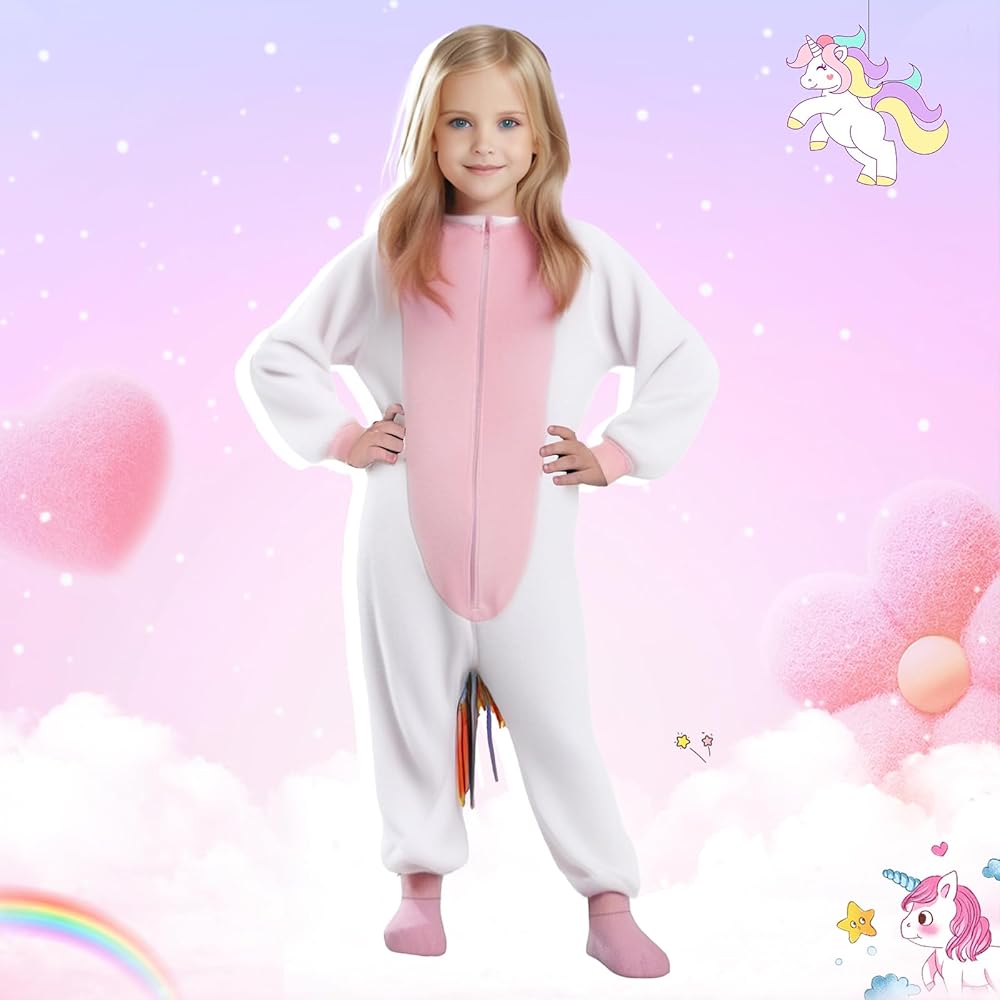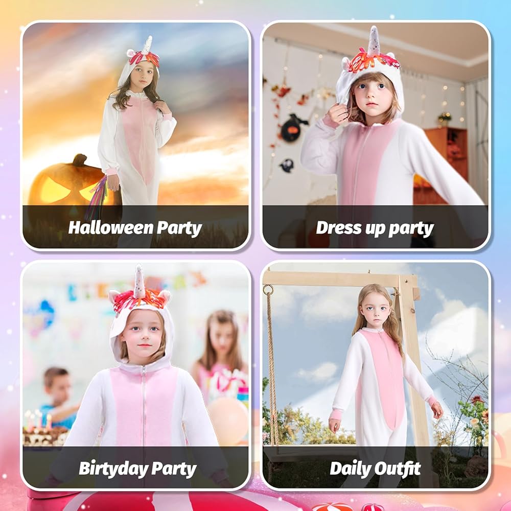 Soft Fabric: The unicorn costume made from quality flannel materials, comfortable, soft, and warm, and the onesie is available in 3 sizes and suits for ages 4-14 years, please refer to our size chart in photos before purchasing.