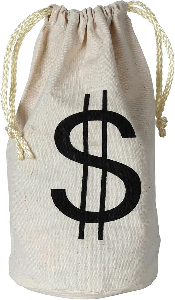 Made of off-white cotton fabric with drawstrings; $ sign printed in black on each bag