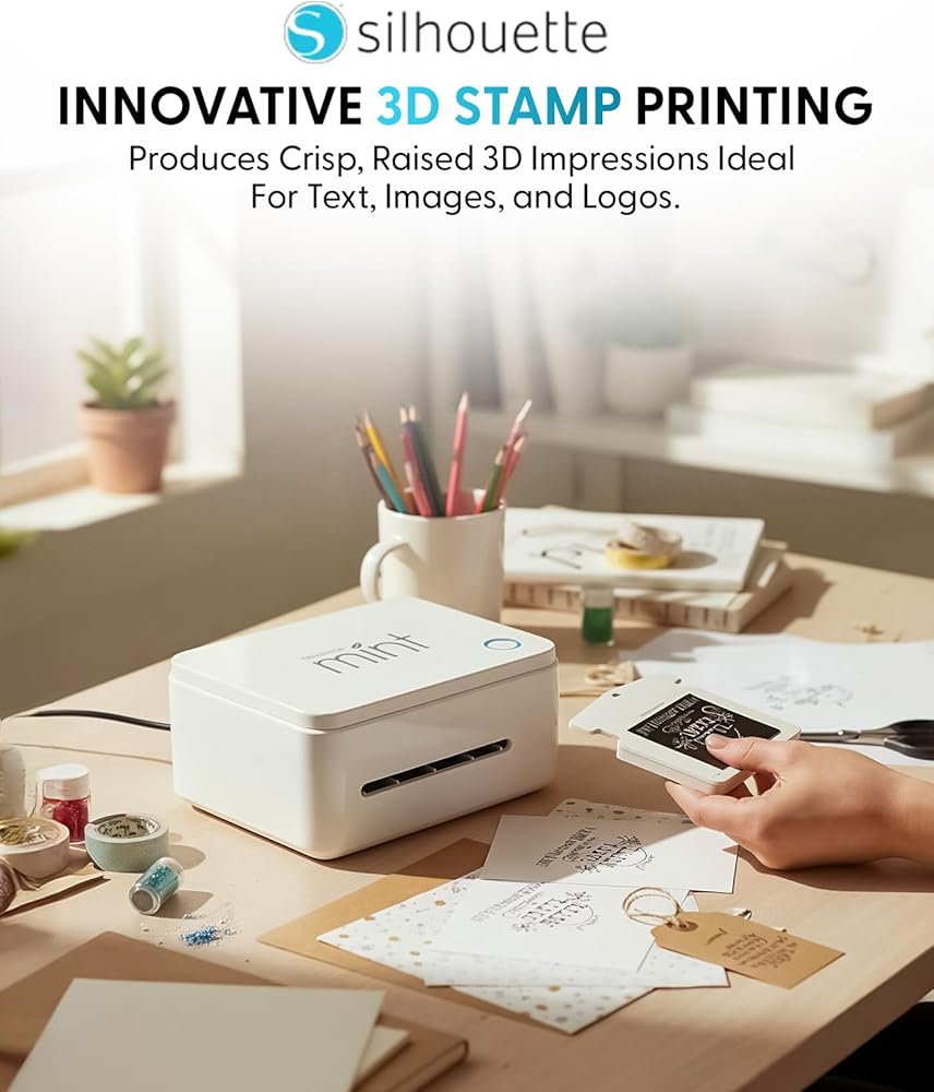 Includes: mint, 15x60 stamp kit, 30x30 stamp kit, (4) ink bottles (black, red, blue, yellow), power cord, USB cord, & quick start guide.