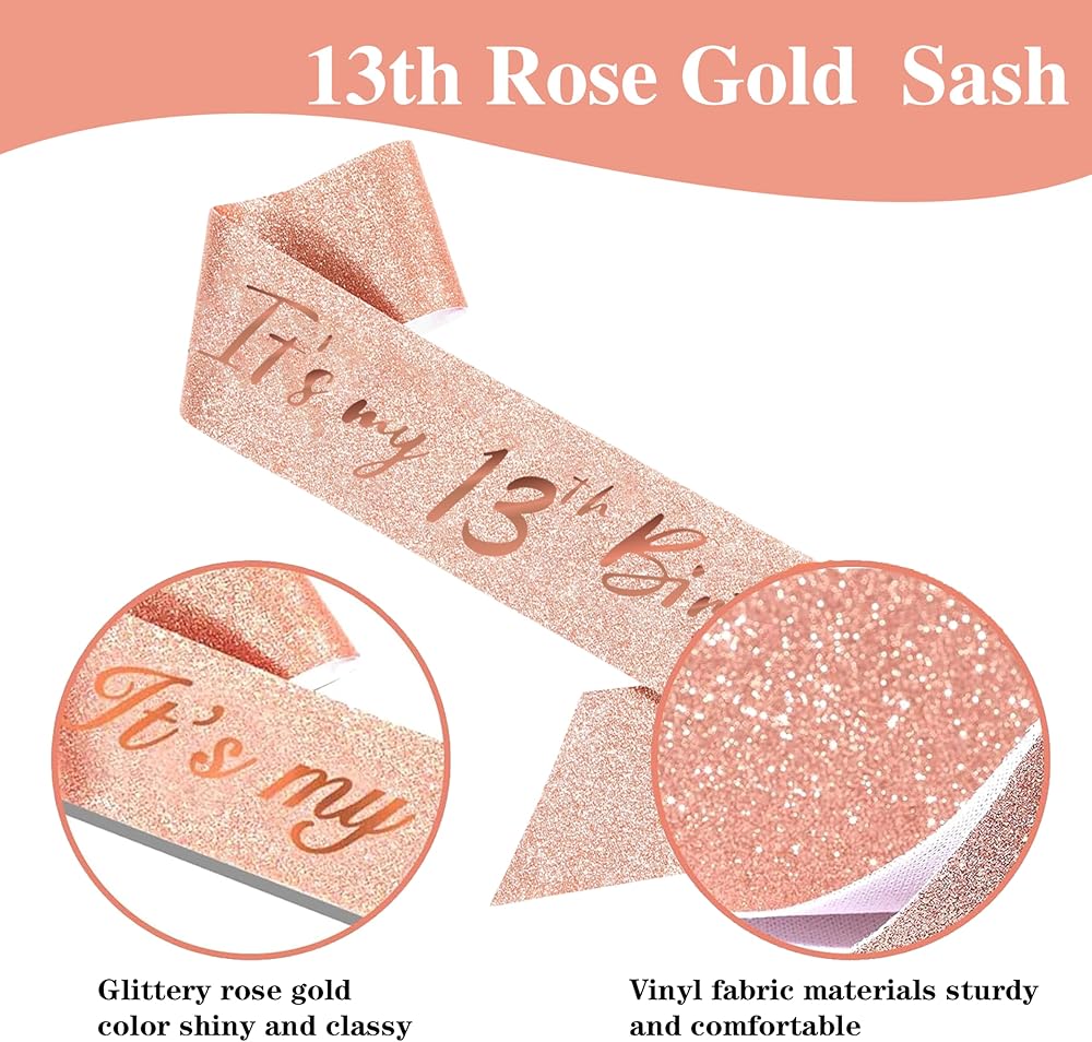 🎉 GLITTERY ROSE GOLD CROWN 15 - Made of high quality alloy and rhinestone. 15th Birthday Tiara is with combs that make sure it can grip the hair more tightly for fitting girls. Dimension: 5.4” on the front side.Our 15th birthday sash is made of high quality glitter fabric with foil“It's my 15th birthday” lettering . The sash is in 63 inch length and comes with a gold charm pin that you can easily adjust the length you need.