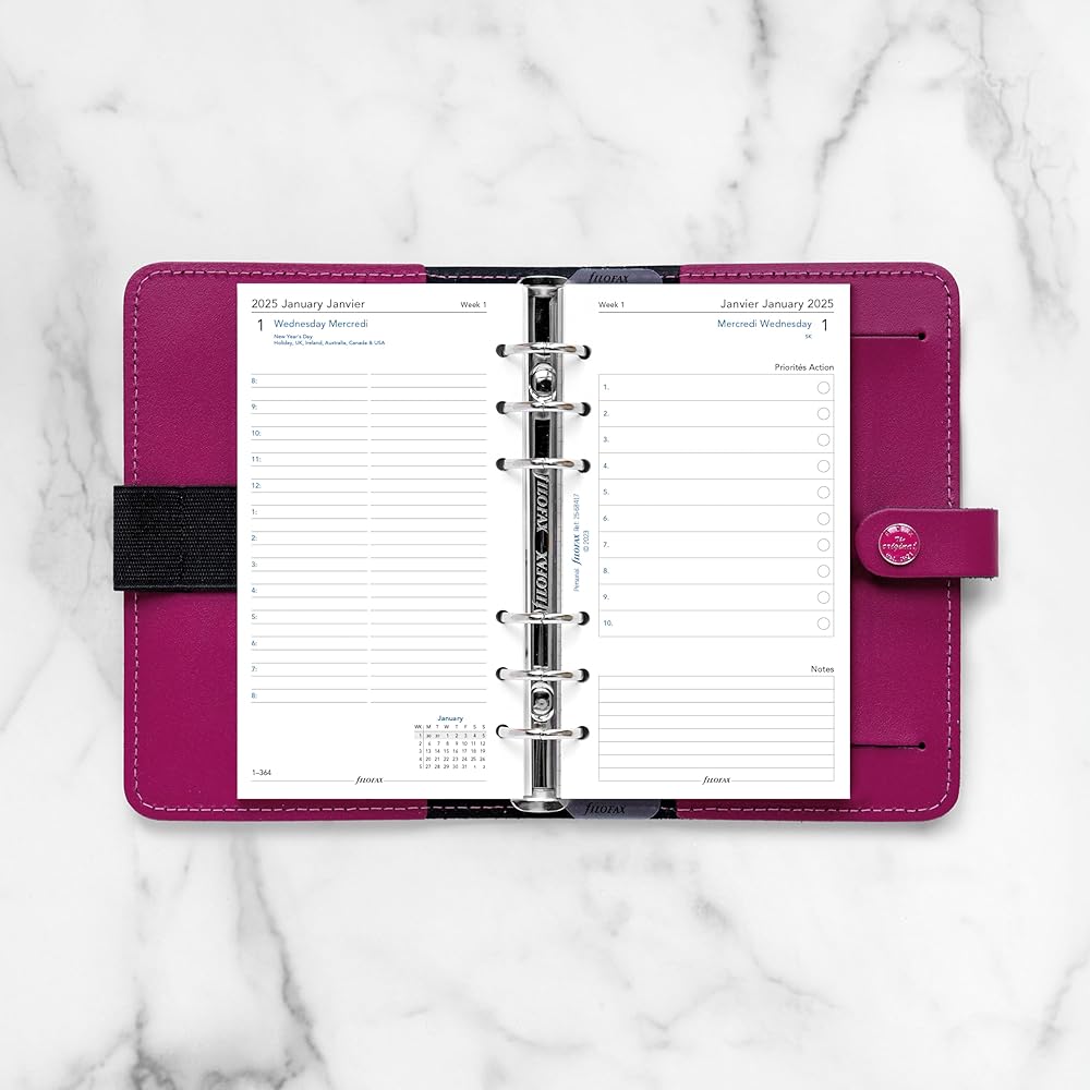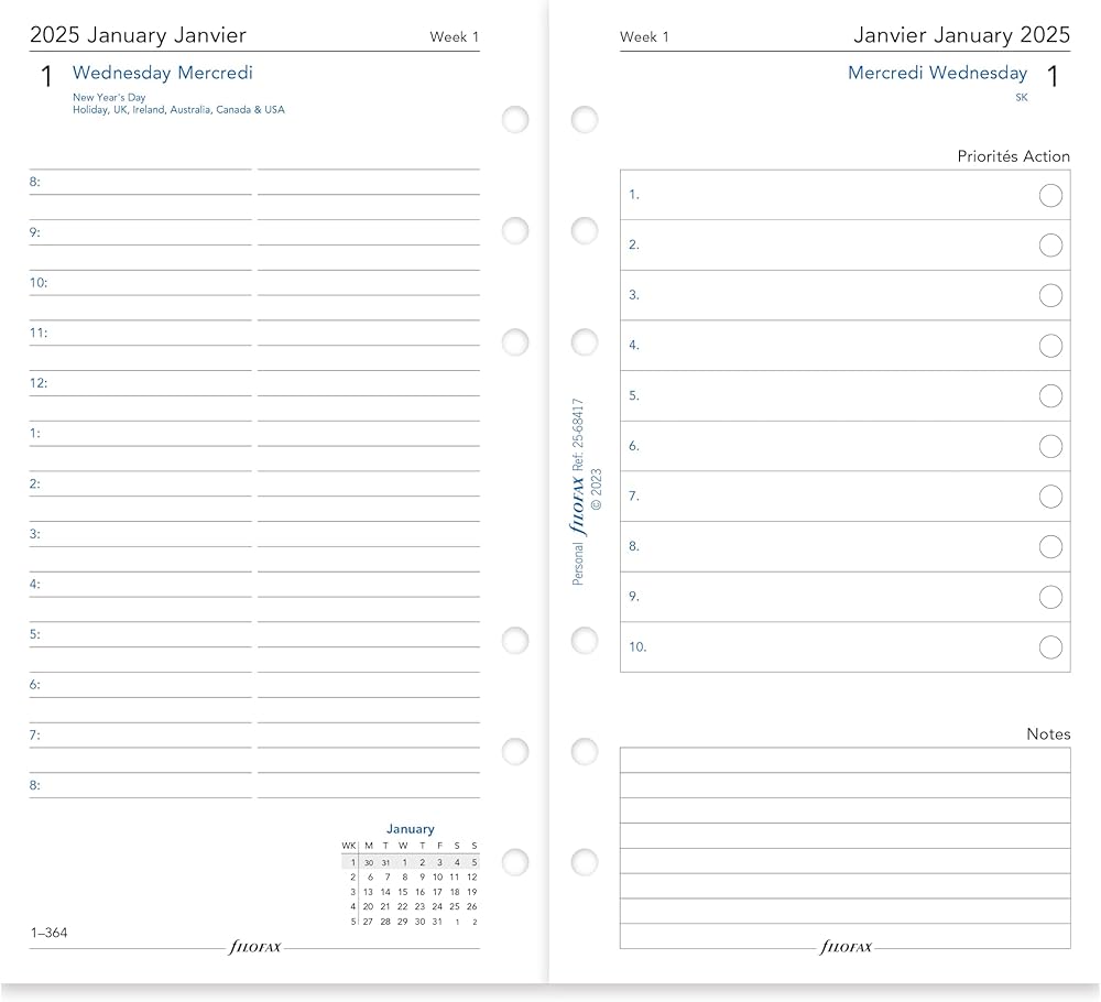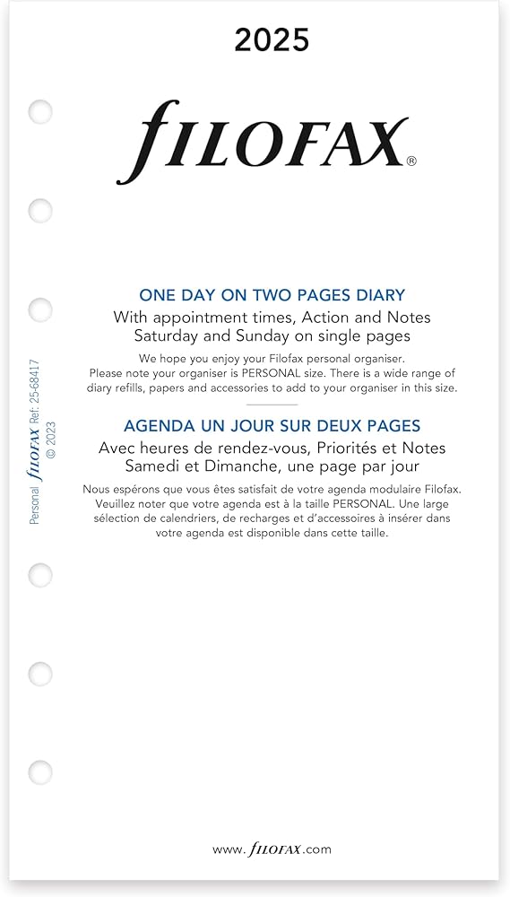 Plan the day in detail with the day on two page diary. Calendar Diary Refill features: Day on two pages with appointments, January to December, 2025. Hourly appointment schedule from 8:00 a.m. to 8:00 p.m. Saturday and Sunday on single pages. Right page has spaces for action items and personal notes. White 80 gsm fountain pen-friendly paper. 328 sheets printed with black and blue ink. Daily dated refill is personal/personal compact size for planners, organizers, agendas and diaries. Bilingual dated calendar diary in two languages: English and French. Over the years, the Filofax organizer has evolved from a simple loose-leaf system into an indispensable everyday accessory. The Filofax logo promises authenticity and the finest craftsmanship. It's a hallmark of impeccable quality, trusted worldwide, since 1921.