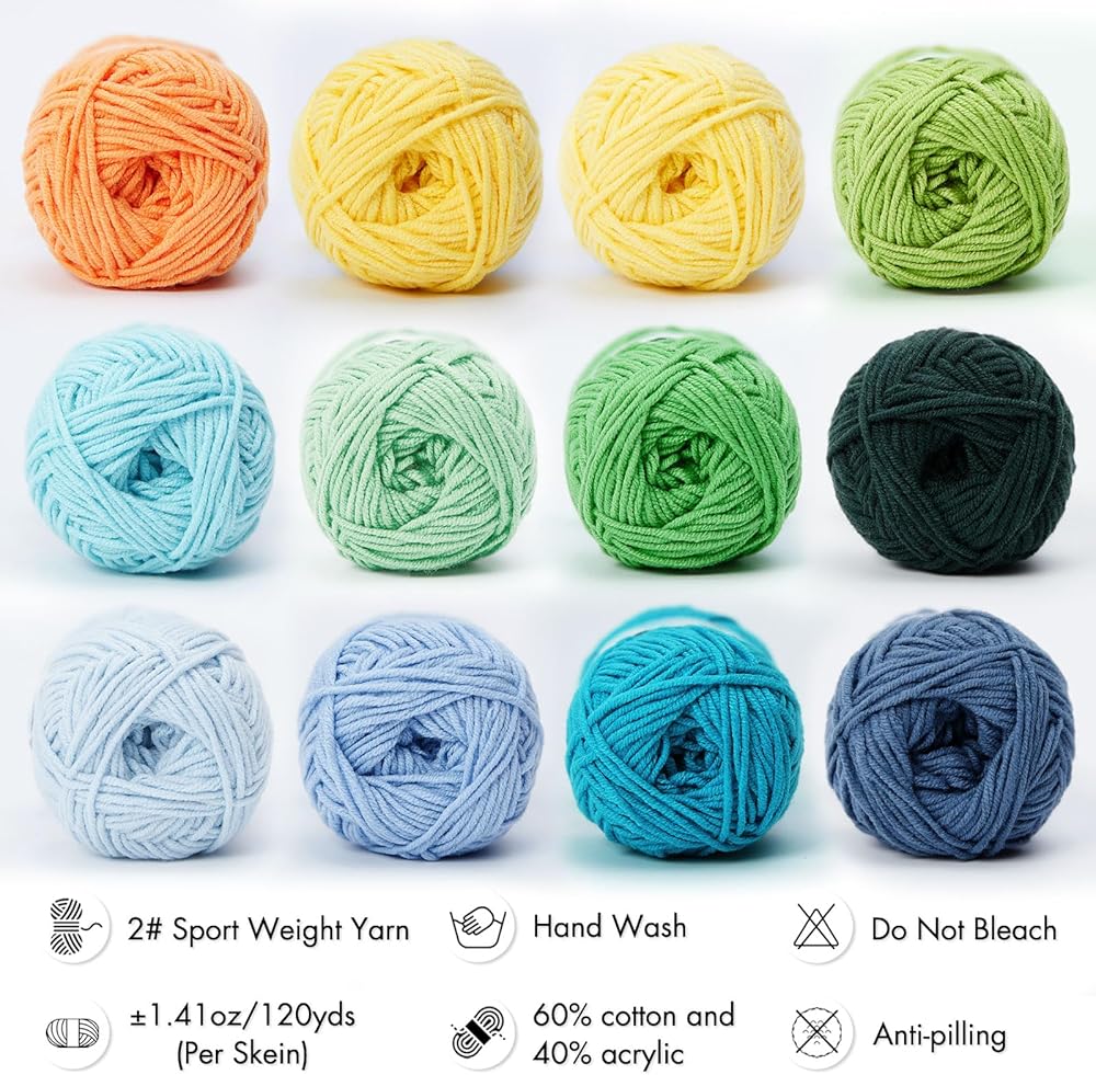 [Premium Quality Yarn] This sport weight yarn is made of 60% cotton and 40% acrylic, anti-pilling,durable and no fade colors yarn for any crochet knitting project. The finished product has a more delicate and refined texture and it's easier to show you perfect project with this baby yarn