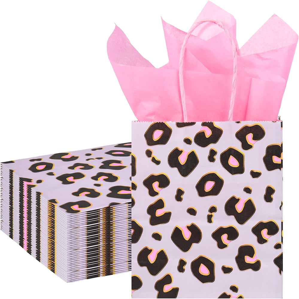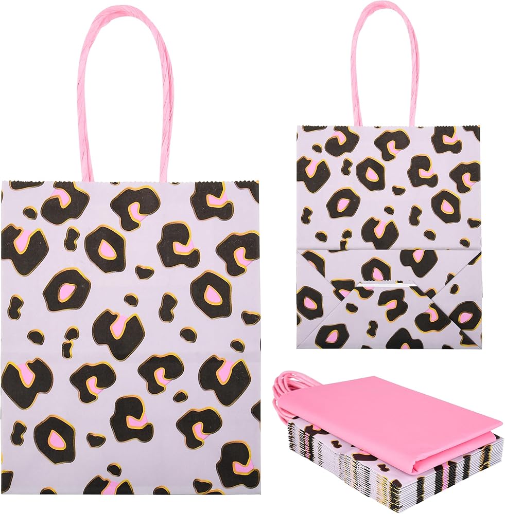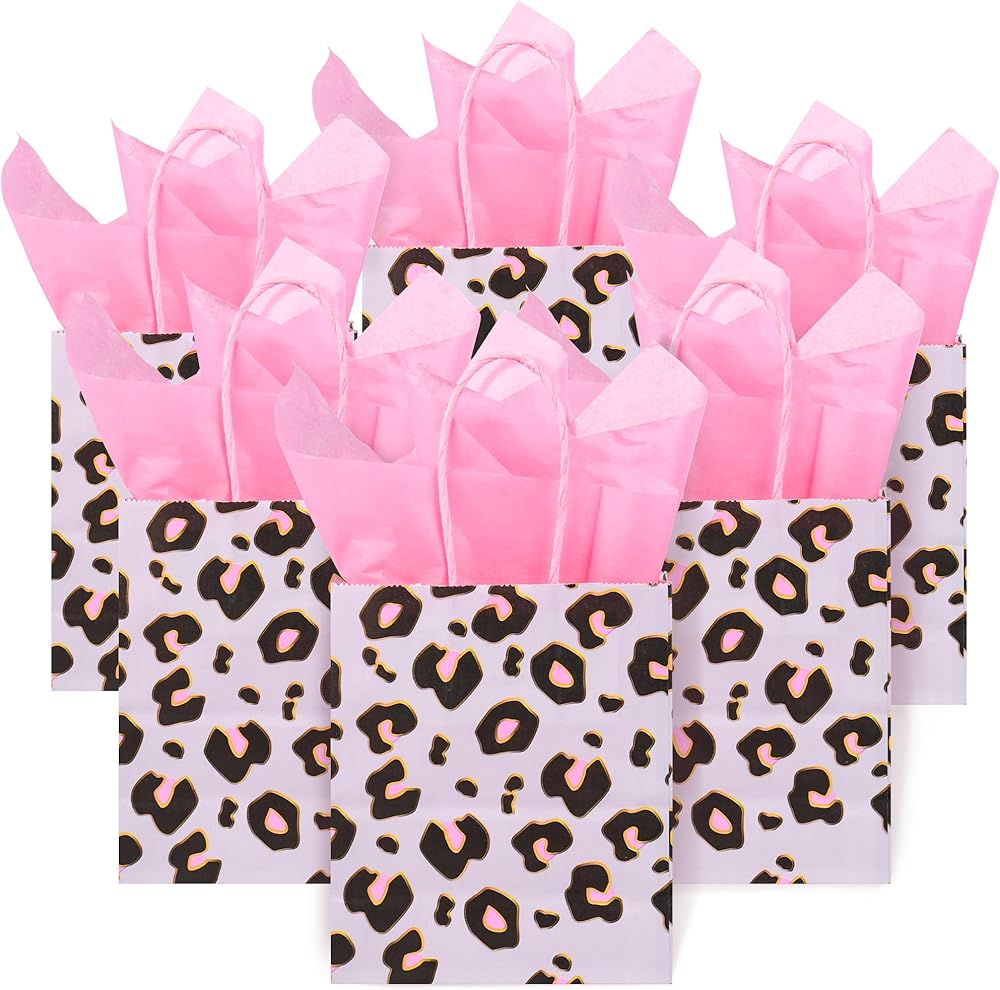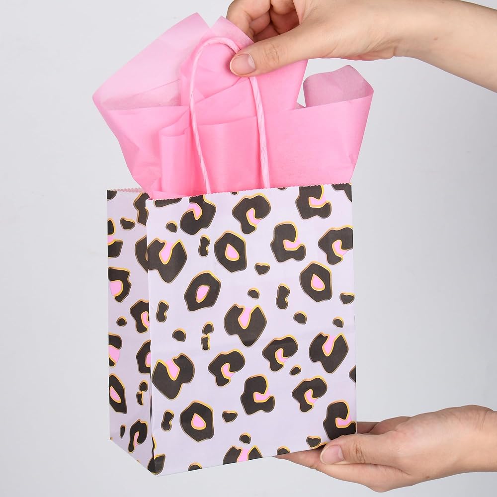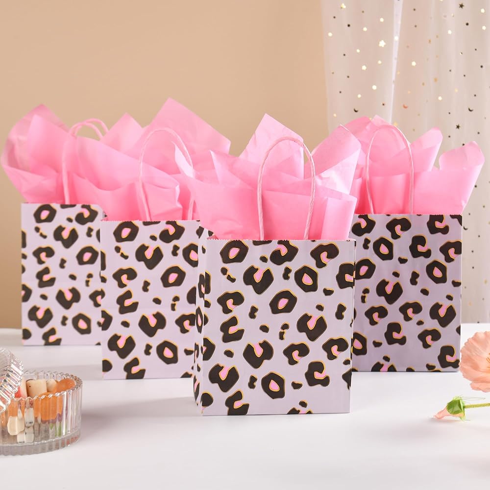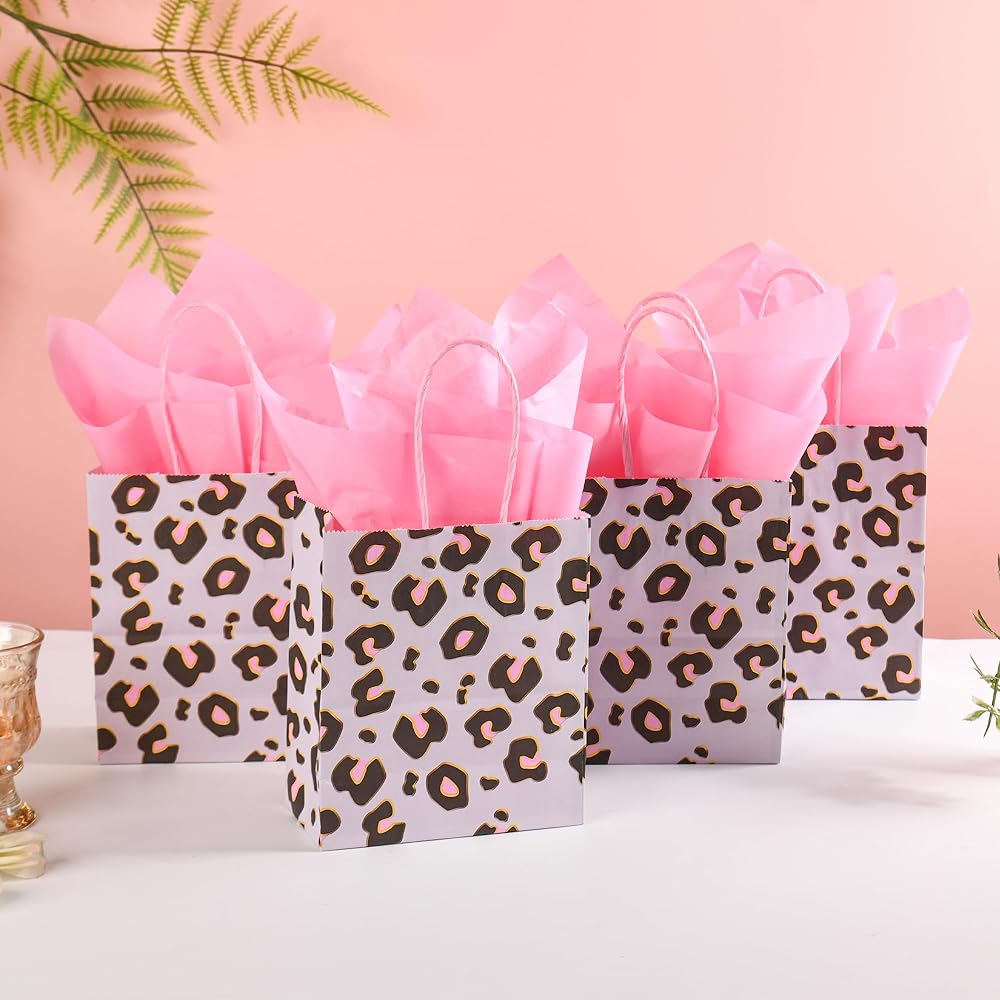 Leopard Print Party Bags: Enhance any party with these cheetah print gift bags with pink tissue paper. These small bags are perfect for adding a touch of wild elegance to any occasion such as fashion-forward birthday parties, trendy bridal showers and bachelorette parties, unique weddings, chic baby showers, or bold holiday parties.