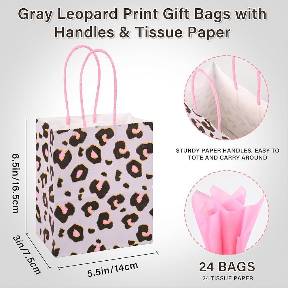 DjinnGlory 24 Pack Mini Small Gray Leopard Cheetah Print Party Favor Bags with Handles and Pink Tissue Paper for Party Favors Goodies, Small Business Gifts, Merchandises, 6.5x5.5x3 Inch