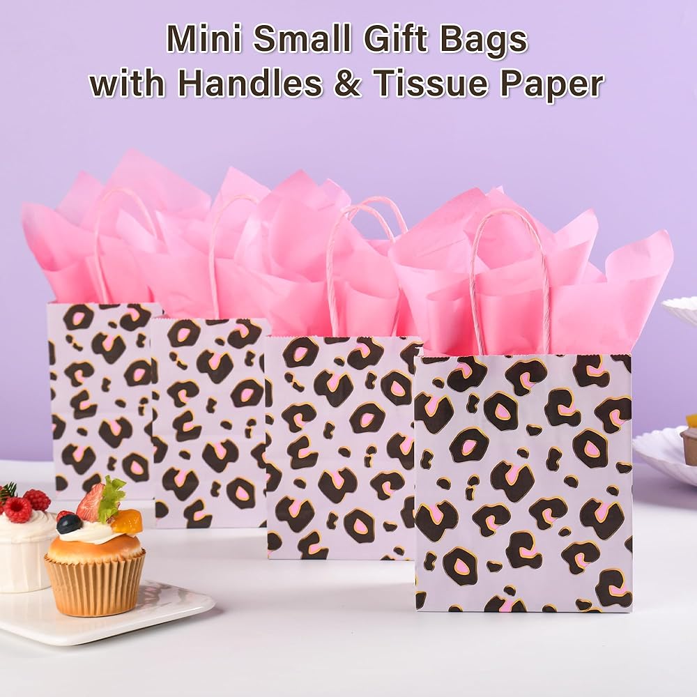 Pack of 24: Purchase includes 24 small pink leopard print party gift bags with 24 sheets of pink tissue paper