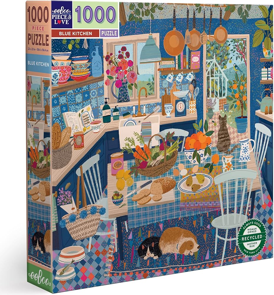 EEBOO PIECE & LOVE: PINK KITCHEN - 1000 PIECE PUZZLE - ADULT SQUARE JIGSAW, 23X23", INCLUDES IMAGE REFERENCE INSERT, GLOSSY HIGH-QUALITY PIECES. Artist Maria Over, meticulously and lovingly renders the Pink Kitchen. Another beautiful and quirky space for Piece and Love's popular series of "Kitchen" puzzles. Enjoy the calm, the animals, flowers, fruits, and summer sea breeze. Our 1,000 piece jigsaw puzzles offer a screen-free, relaxing way to practice contemplative mindfulness or share a gentle cooperative activity with friends and family. Perfect gift for a special friend, family member, work colleague or host or hostess. INSIDE THE BOX: 1000 sturdy pieces that are glossy coated on 2 sides and dustless. Great fit. Includes color insert of the puzzle image. Puzzle size when completed: 23 inches x 23 inches. Box: 11" x 2" x 11". ABOUT THE ARTIST: Maria Over is part Dutch, part Greek and lives in Munich, Germany, with her two children. She is inspired by nature and loves to paint lush watercolors. Maria describes her illustration for eeBoo as a magical moment captured in time – beautiful moths filling the night air with their silent flutter; vibrant, otherworldly, and dreamy.