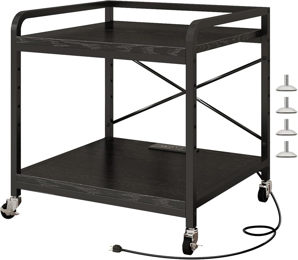 Under Desk Printer Stand with Power Outlet Large Printer Table with Adjustable Shelf,Industrial Wheels, 20 Inches Deep 2 Tier Rolling Printer Cart for Home Office, Black