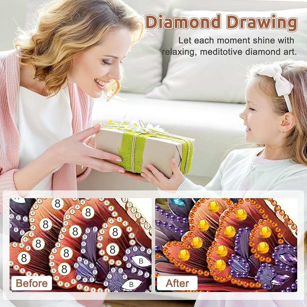 Crystal Art: Using a combination of specially shaped diamonds and design patterns, this diamond art is a new type of diamond, with circular, droplet shaped, and diamond shaped columns.