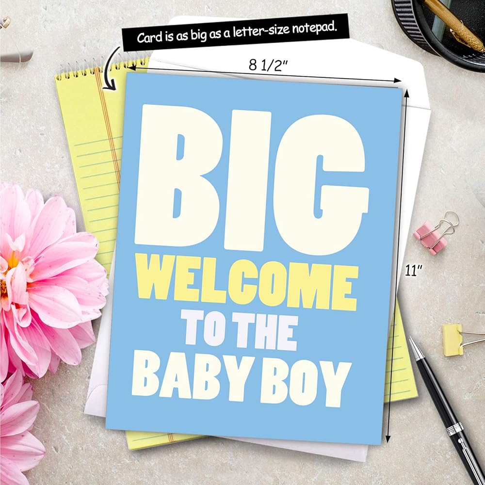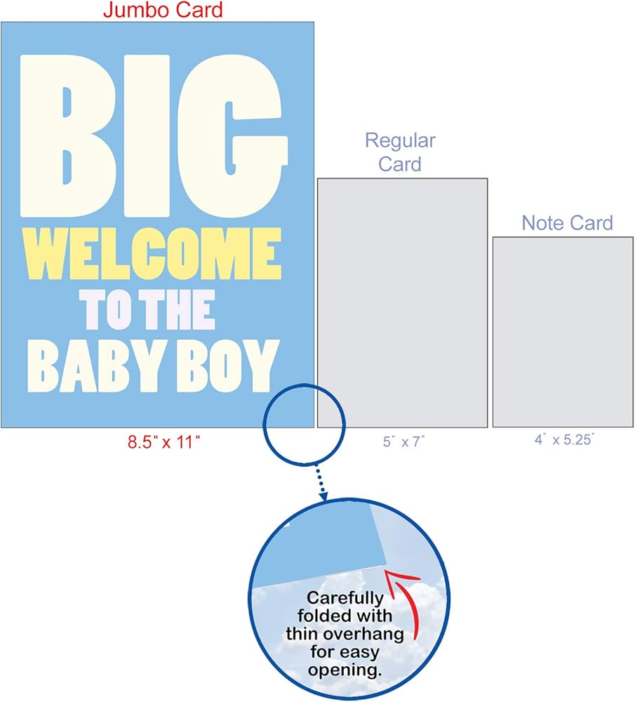 SIZE: Giant Baby wishes would require a giant 8.5'' by 11'' Greeting Card. Our big, 8.5" x 11" letterhead-size greeting cards can be described as extra-large, giant, huge or oversized, but one thing's for sure… they have an extra large impact and leave huge memorable impressions!