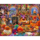 Dive into the whimsical world of Halloween with this vibrant and detailed puzzle by artist Gina Jane. The scene features a cozy, magical living room decked out for the holiday, complete with a friendly witch, glowing jack-o'-lanterns, and festive decorations. A warm fireplace crackles in the background, while children dressed in costumes immerse themselves in the Halloween fun. The rich colors, intricate details, and playful atmosphere make this 1000 piece puzzle a delightful challenge and a perfect way to celebrate the spooky season. Ideal for Halloween lovers and puzzle enthusiasts alike!