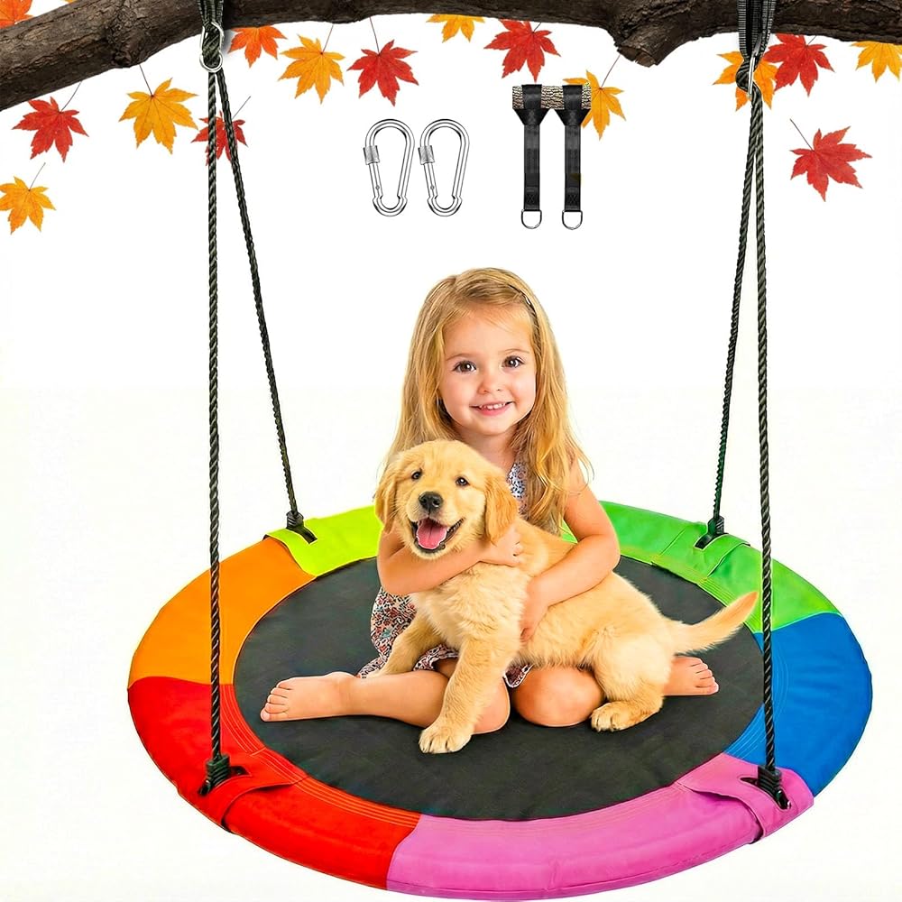 【Easy to assemble & Many Accessories Included】The tree swings for kids outdoor includes two reinforced swing straps and heavy-duty galvanized locking carabiners that allow you to hang the saucer round swing on a tree. Detachable design, easy to assemble, No bolts and wrenches required, quick installation in 5 minutes.