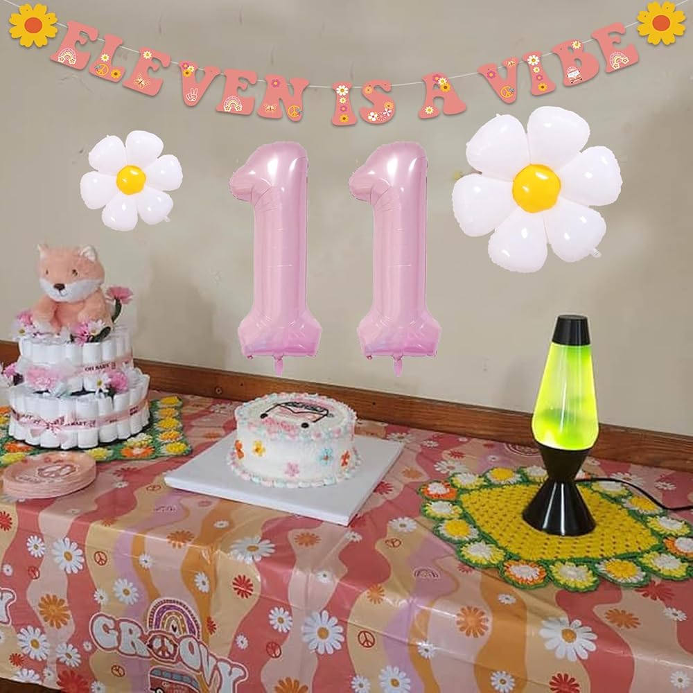 Groovy 5th Birthday Decorations:Includes 1 set of five is a vibe banner and 1 roll of ribbon for hanging,1pcs rainbow balloon,1pcs big daisy flower balloon,1pcs 18'' white daisy flower balloons,1pcs 40'' pink number 5 balloon,6pcs cupcake toppers