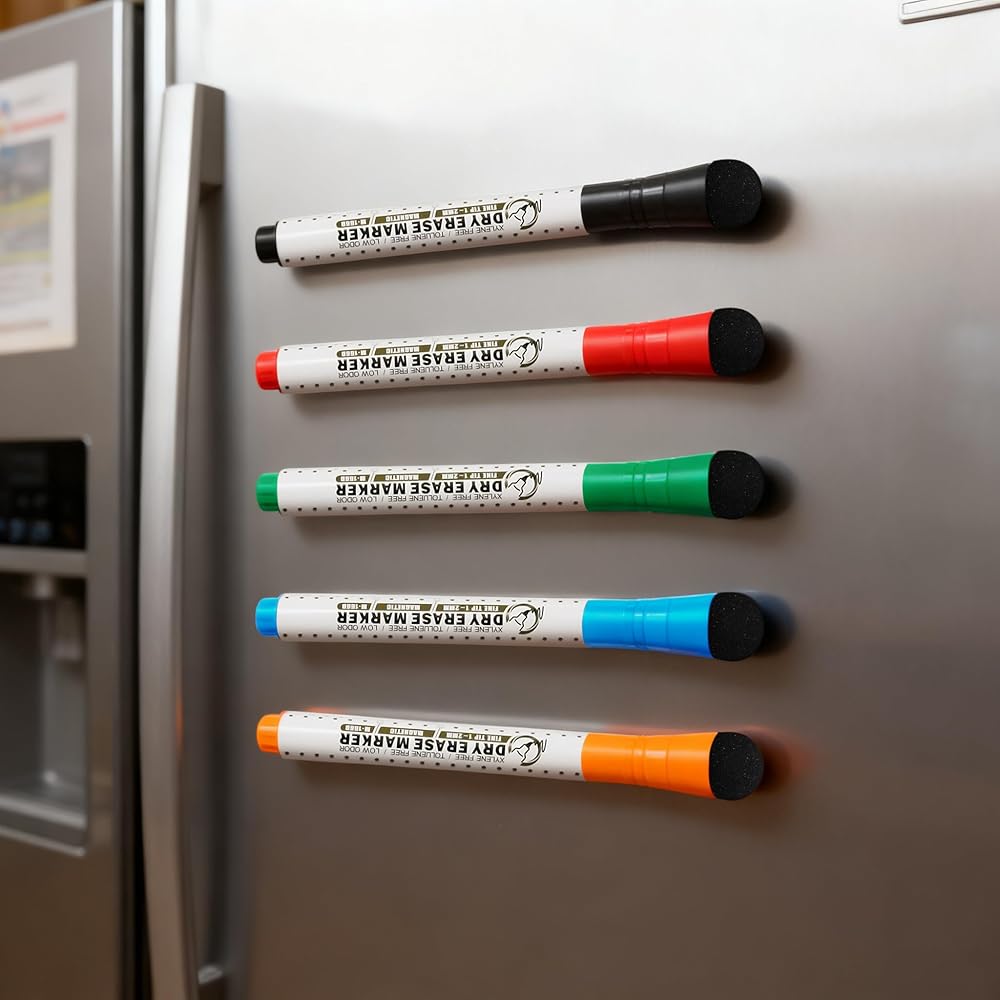 Mag-Fancy Magnetic Dry Erase Markers, Fine Tip 1mm, With Built-In Eraser & Dual Magnets, Low Odor Safe Ink, 5 Color Set for Whiteboard, Refrigerator & Calendar