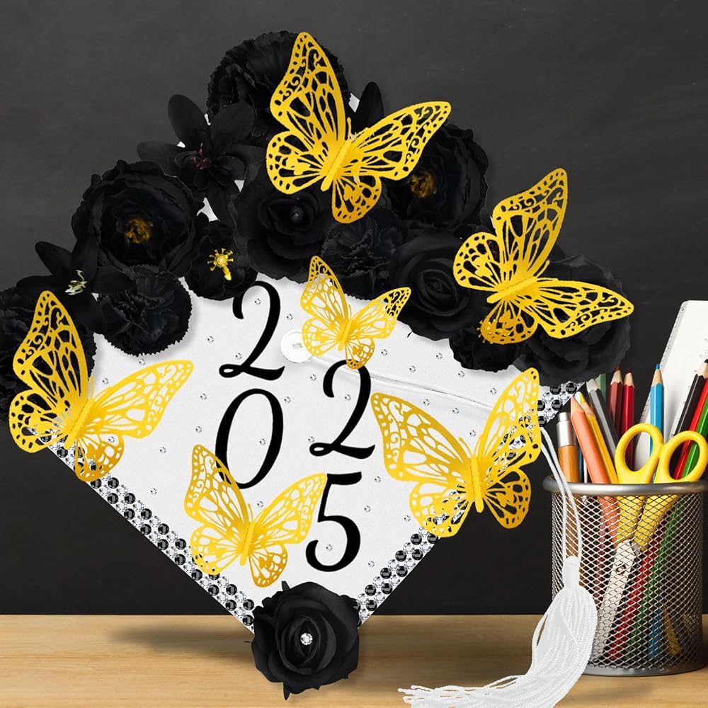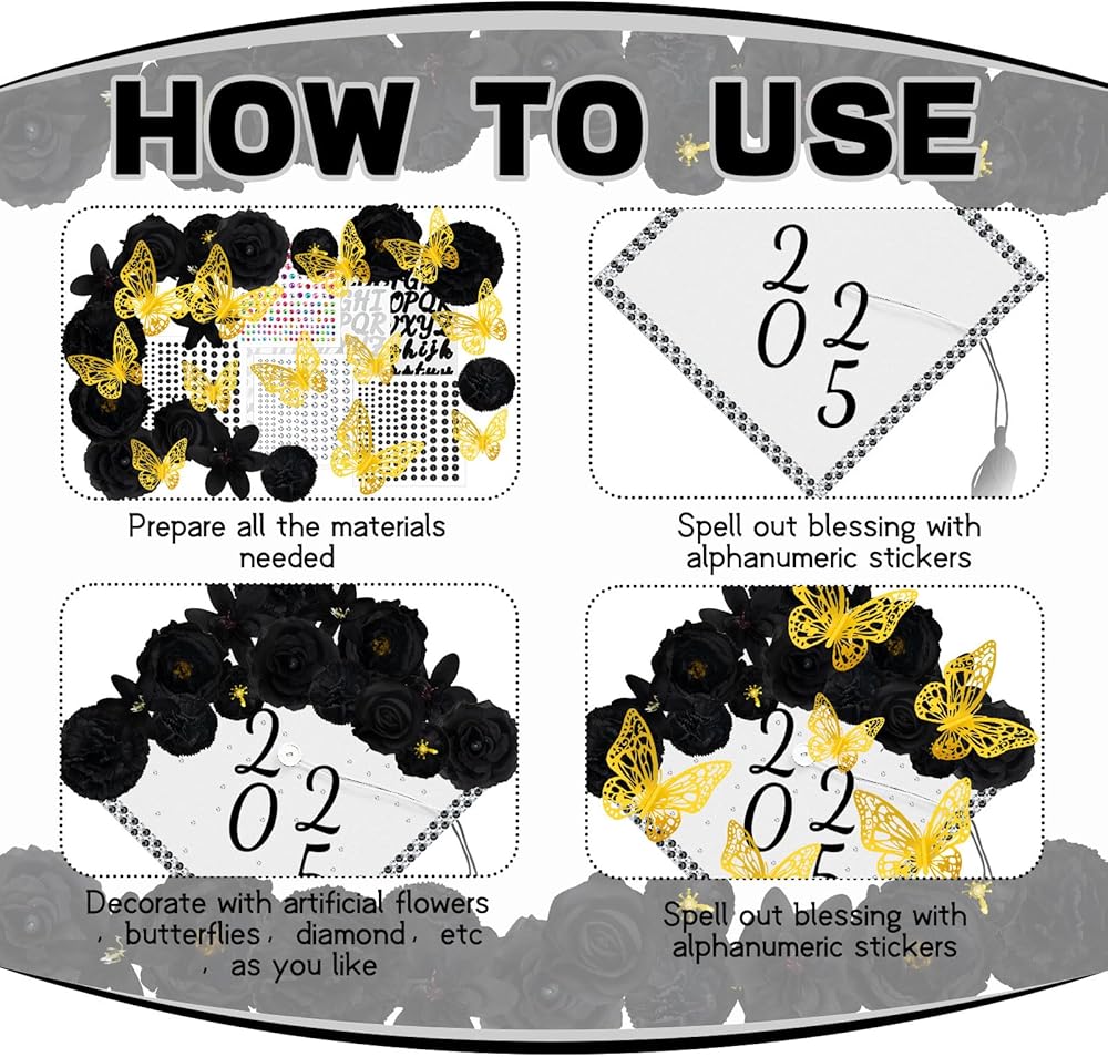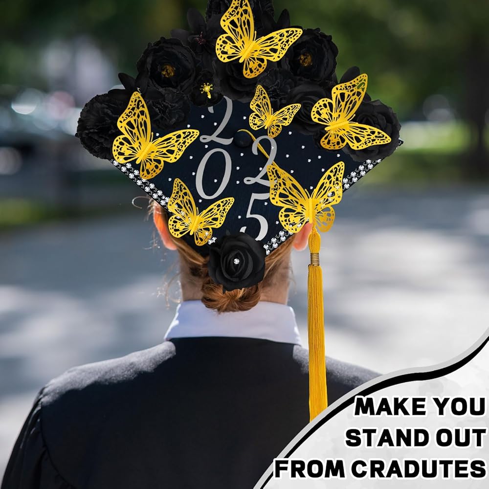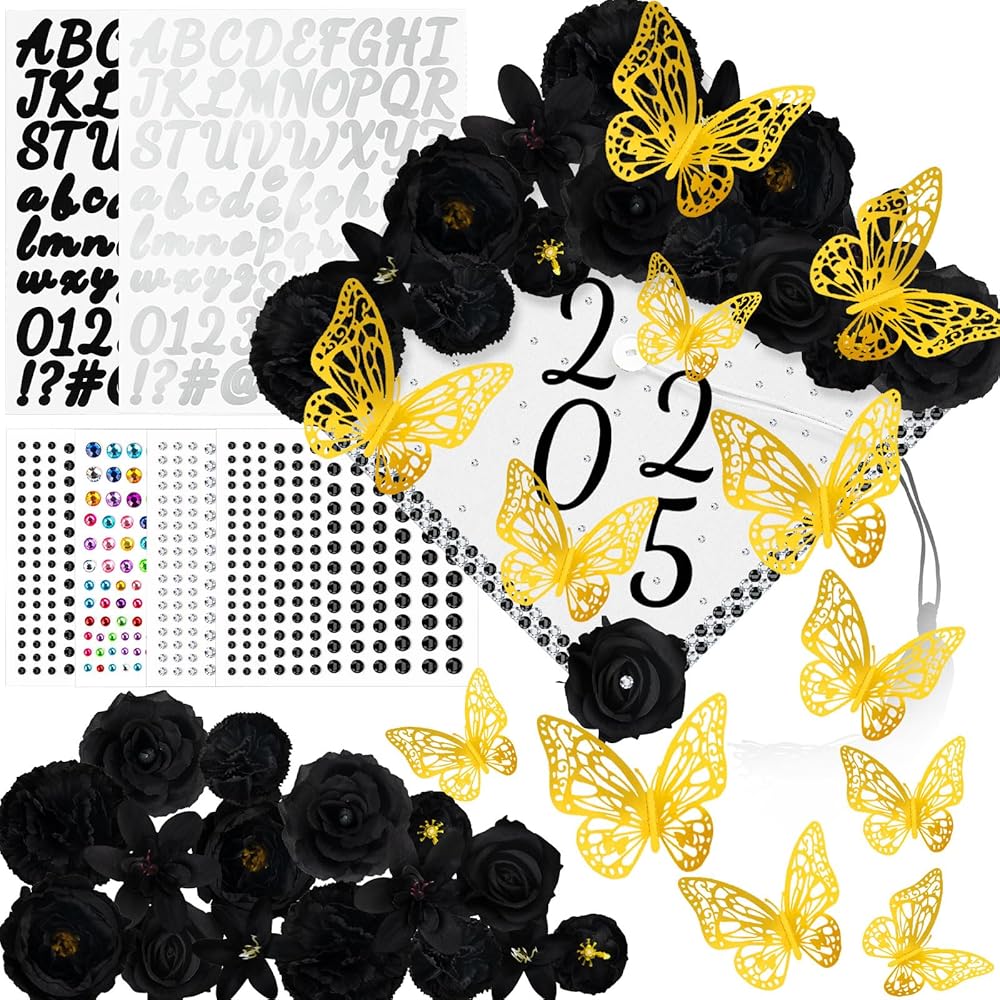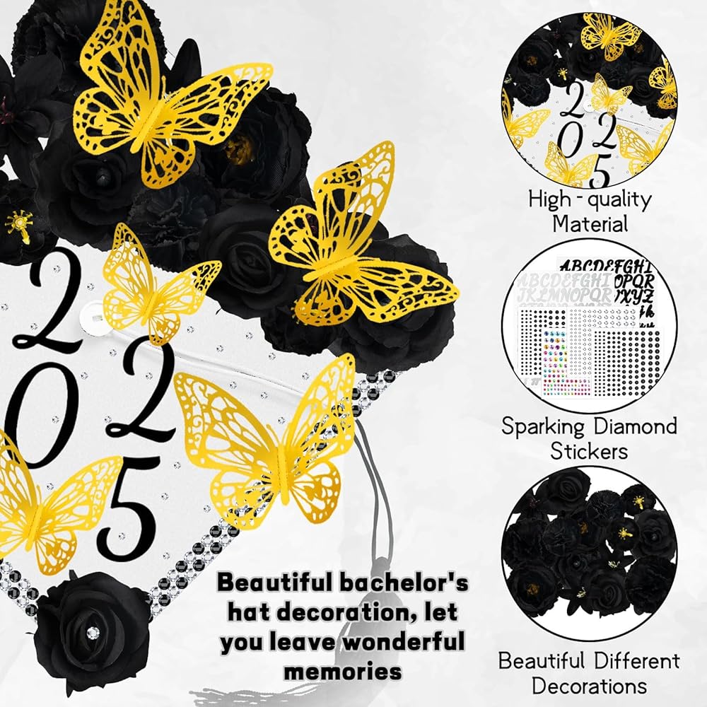 Graduation Cap Decorations Kits: The package includes 1 set of faux flower heads, 2 pieces of letter stickers, 12 pieces of 3D butterflies ornaments and 4 pieces of rhinestones stickers, the thoughtful set will meet your need to decorate your hat
